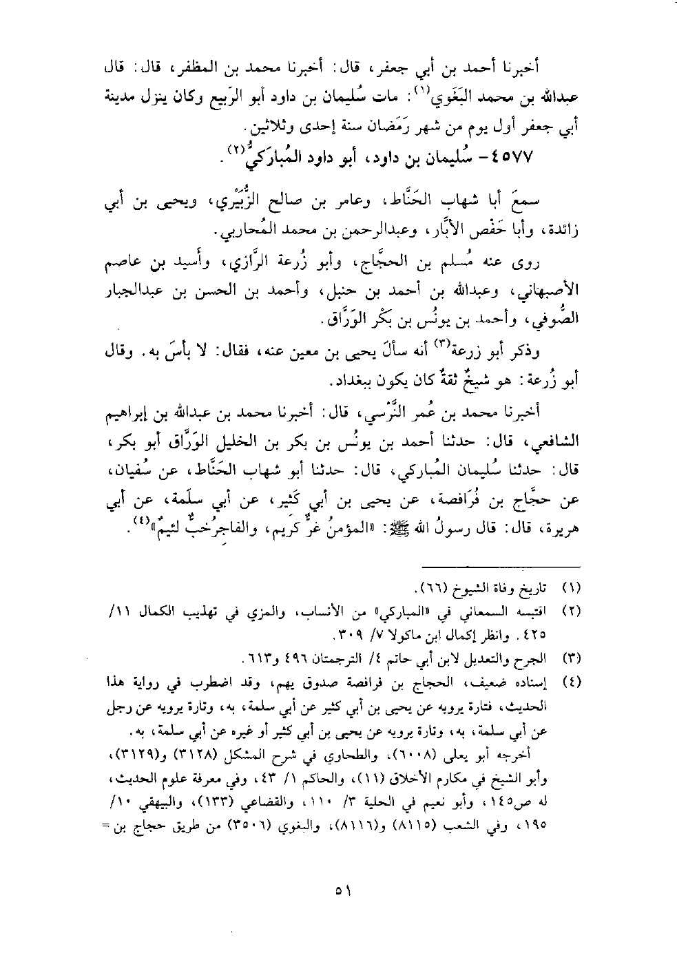 (2950) -[10: 51] أَخْبَرَنَا مُحَمَّدُ بْنُ عُمَرَ النَّرْسِيُّ، قَالَ: أَخْبَرَنَا مُحَمَّدُ بْنُ عَبْدِ اللَّهِ بْنِ إِبْرَاهِيمَ الشَّافِعِيُّ، قَالَ: حَدَّثَنَا أَحْمَدُ بْنُ يُونُسَ بْنِ بَكْرِ بْنِ الْخَلِيلِ الْوَرَّاقُ أَبُو بَكْرٍ، قَالَ: حَدَّثَنَا سُلَيْمَانُ الْمُبَارَكِيُّ، قَالَ: حَدَّثَنَا أَبُو شِهَابٍ الْحَنَّاطُ، عَنْ سُفْيَانَ، عَنْ حَجَّاجِ بْنِ فُرَافِصَةَ، عَنْ يَحْيَى بْنِ أَبِي كَثِيرٍ، عَنْ أَبِي سَلَمَةَ، عَنْ أَبِي هُرَيْرَةَ، قَالَ: قَالَ رَسُولُ اللَّهِ صَلَّى اللَّهُ عَلَيْهِ وَسَلَّمَ: " الْمُؤْمِنُ غِرٌّ كَرِيمٌ، وَالْفَاجِرُ خَبٌّ لَئِيمٌ " أَخْبَرَنَا ابن الفضل، قال: أَخْبَرَنَا جعفر الخلدي، قال: حَدَّثَنَا محمد بن عبد الله الحضرمي، قال: سنة إحدى وثلاثين ومائتين فيها مات سليمان بن داود المباركي.