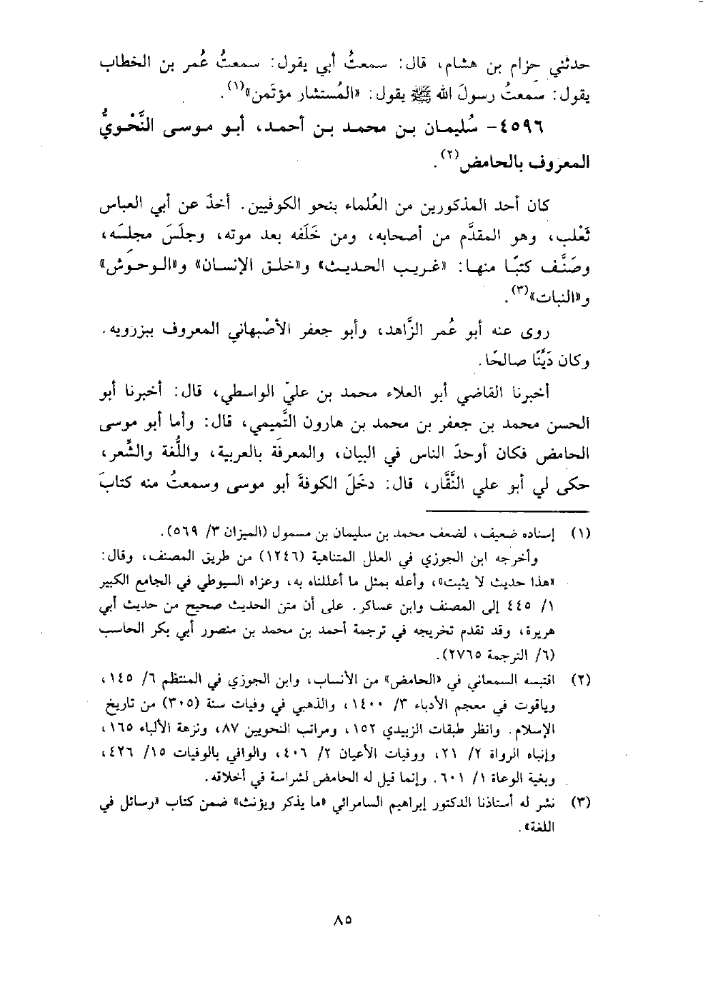 4596 - سليمان بن محمد بن أحمد أبو موسى النحوي المعروف بالحامض كان أحد المذكورين من العلماء بنحو الكوفيين.