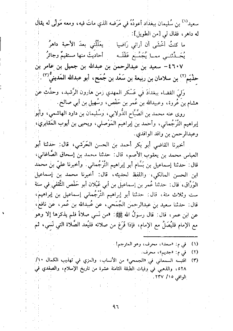 4607 - سعيد بن عبد الرحمن بن عبد الله بن جميل بن عامر بن حذيم بن سلامان بن ربيعة بن سعد بن جمح أبو عبد الله المديني. ولي القضاء ببغداد في عسكر المهدي زمن هارون الرشيد، وحدث عن هشام بن عروة، وعبيد الله بن عمر بن حفص، وسهيل بن أبي صالح.