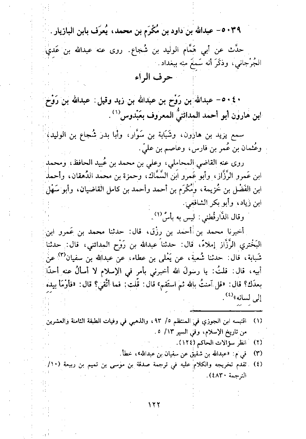 5040 - عبد اللَّه بن روح بن عبد اللَّه بن زيد وقيل عبد اللَّه بن روح بن هارون أبو أَحْمَد المدائني المعروف بعبدوس سَمِعَ يزيد بْن هارون، وشبابة بْن سَوَّار، وأبا بدر شجاع بْن الوليد، وعثمان بْن عُمَر بْن فارس، وعاصم بْن علي.