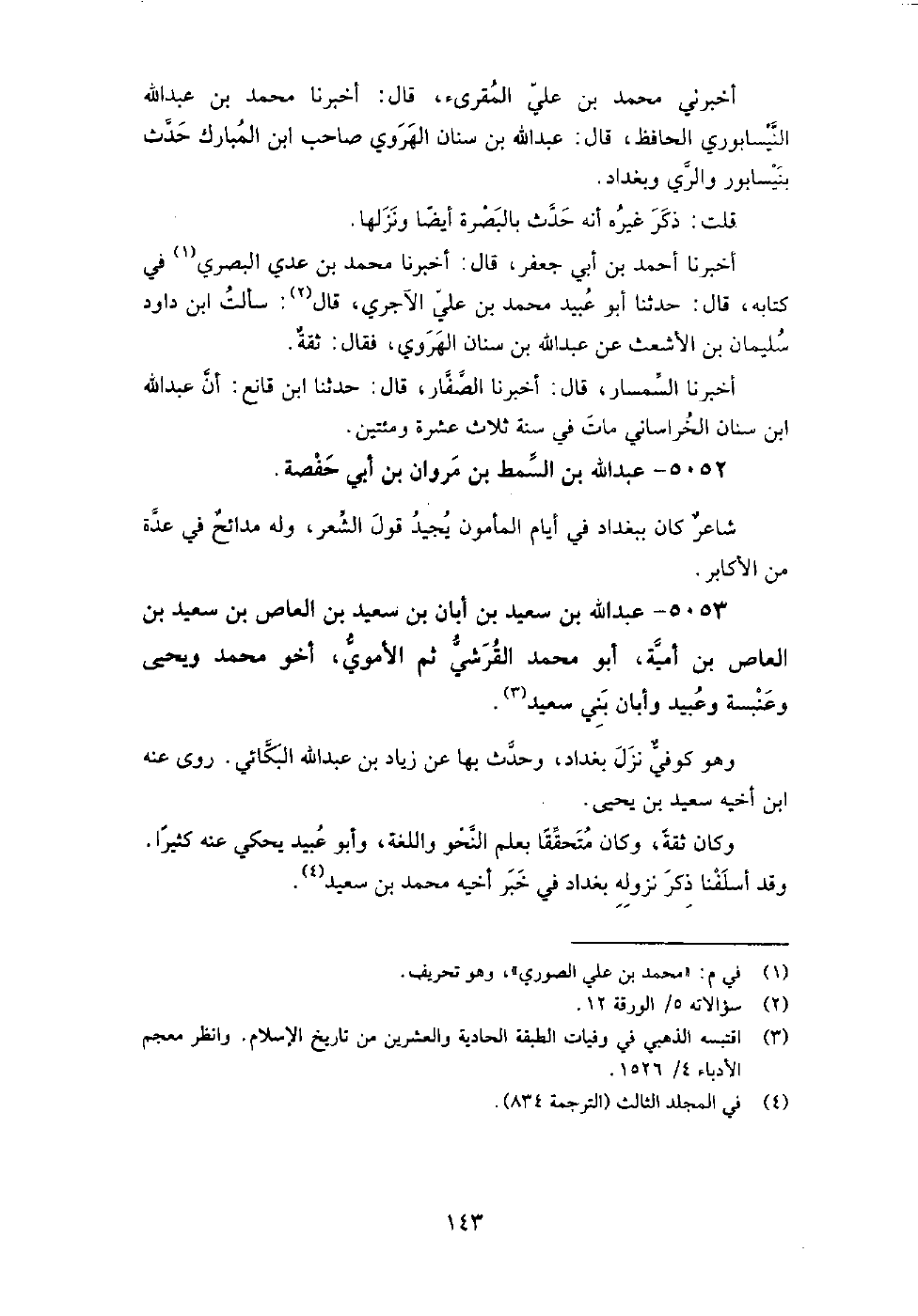5053 - عبد اللَّه بن سعيد بن أبان بن سعيد بن العاص بن سعيد بن العاص بن أمية أبو مُحَمَّد القرشي ثم الأموي أخو مُحَمَّد ويَحْيَى وعنبسة وعبيد وأبان بني سعيد وهو كوفي نزل بغداد، وحدث بها عن زياد بن عبد اللَّه البكائي.