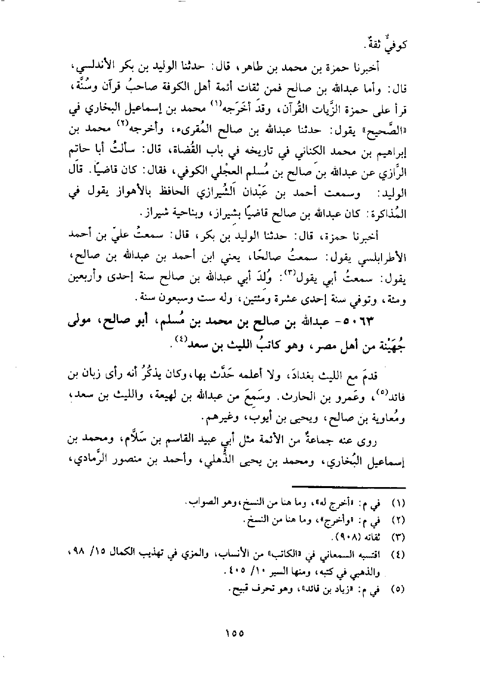 5063 - عبد اللَّه بن صالح بن مُحَمَّد بن مسلم أَبُو صَالِحٍ مولى جهينة من أهل مصر وهو كاتب الليث بن سعد قدم مع الليث بغداد، ولا أعلمه حدث بها، وكان يذكر أنه رأى زياد بن فائد، وعمرو بن الحارث.
