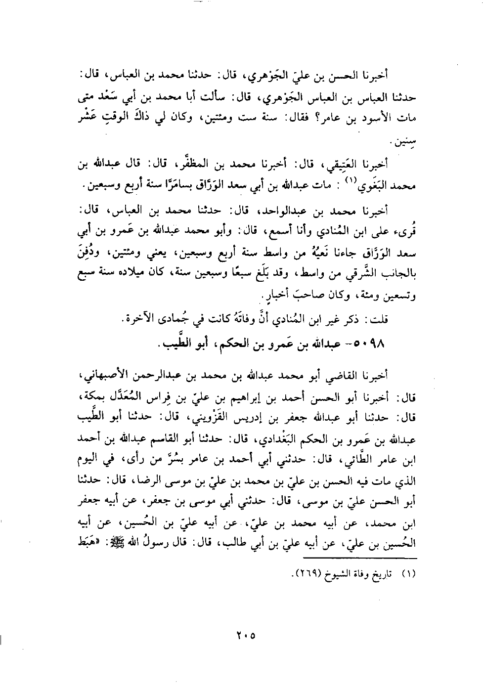(3264) -[11: 205] أَخْبَرَنَا الْقَاضِي أَبُو مُحَمَّدٍ عَبْدُ اللَّهِ بْنُ مُحَمَّدِ بْنِ عَبْدِ الرَّحْمَنِ الأَصْبَهَانِيُّ، قَالَ: أَخْبَرَنَا أَبُو الْحَسَنِ أَحْمَدُ بْنُ إِبْرَاهِيمَ بْنِ عَلِيِّ بْنِ فِرَاسٍ الْمُعَدَّلُ، بِمَكَّةَ، قَالَ: حَدَّثَنَا أَبُو عَبْدِ اللَّهِ جَعْفَرُ بْنُ إِدْرِيسَ الْقَزْوِينِيُّ، قَالَ: حَدَّثَنَا أَبُو الطَّيِّبِ عَبْدُ اللَّهِ بْنُ عَمْرِو بْنِ الْحَكَمِ الْبَغْدَادِيُّ، قَالَ: حَدَّثَنَا أَبُو الْقَاسِمِ عَبْدُ اللَّهِ بْنُ أَحْمَدَ بْنِ عَامِرٍ الطَّائِيُّ، قَالَ: حَدَّثَنِي أبي أَحْمَدُ بْنُ عَامِرٍ بِسُرَّ مَنْ رَأَى قَالَ: حَدَّثَنَا أَبُو الْحَسَنِ عَلِيُّ بْنُ مُوسَى، قَالَ: حَدَّثَنِي أَبِي مُوسَى بْنُ جَعْفَرٍ، قَالَ: عَنْ أَبِيهِ جَعْفَرِ بْنِ مُحَمَّدٍ، عَنْ أَبِيهِ مُحَمَّدِ بْنِ عَلِيٍّ، عَنْ أَبِيهِ عَلِيِّ بْنِ الْحُسَيْنِ، عَنْ أَبِيهِ الْحُسَيْنِ بْنِ عَلِيٍّ، عَنْ أَبِيهِ عَلِيِّ بْنِ أَبِي طَالِبٍ، قَالَ: قَالَ رَسُولُ اللَّهِ صَلَّى اللَّهُ عَلَيْهِ وَسَلَّمَ: " هَبَطَ عَلَيَّ جِبْرِيلُ وَعَلَيْهِ قِبَاءٌ أَسْوَدٌ، وَعِمَامَةٌ سَوْدَاءُ، فَقُلْتُ: مَا هَذِهِ الصُّورَةُ الَّتِي لَمْ أَرَكَ هَبَطْتَ عَلَيَّ فِيهَا قَطُّ؟ قَالَ: هَذِهِ صُورَةُ الْمُلُوكِ مِنْ وَلَدِ الْعَبَّاسِ عَمِّكَ، قُلْتُ: وَهُمْ عَلَى حَقٍّ؟ قَالَ جِبْرِيلُ: نَعَمْ! قَالَ النَّبِيُّ صَلَّى اللَّهُ عَلَيْهِ وَسَلَّمَ: اللَّهُمَّ اغْفِرْ لِلْعَبَّاسِ وَوَلَدِهِ حَيْثُ كَانُوا، وَأَيْنَ كَانُوا، قَالَ جِبْرِيلُ: لَيَأْتِيَنَّ عَلَى أُمَّتِكَ زَمَانٌ يُعِزُّ اللَّهُ الإِسْلامَ بِهَذَا السَّوَادِ، قُلْتُ: رِئَاسَتُهُمْ مِمَّنْ؟ قَالَ: مِنْ وَلَدِ الْعَبَّاسِ، قَالَ: قُلْتُ: وَأَتْبَاعُهُمْ؟ قَالَ: مِنْ أَهْلِ خُرَاسَانَ، قُلْتُ: وَأَيُّ شَيْءٍ يَمْلُكُ وَلَدُ الْعَبَّاسِ؟ قَالَ: يَمْلِكُونَ الأَصْفَرَ، وَالأَخْضَرَ، وَالْحَجَرَ، وَالْمَدَرَ، وَالسَّرِيرَ، وَالْمِنْبَرَ، وَالدُّنْيَا إِلَى الْمَحْشَرِ، وَالْمُلْكُ إِلَى الْمَنْشَرِ "