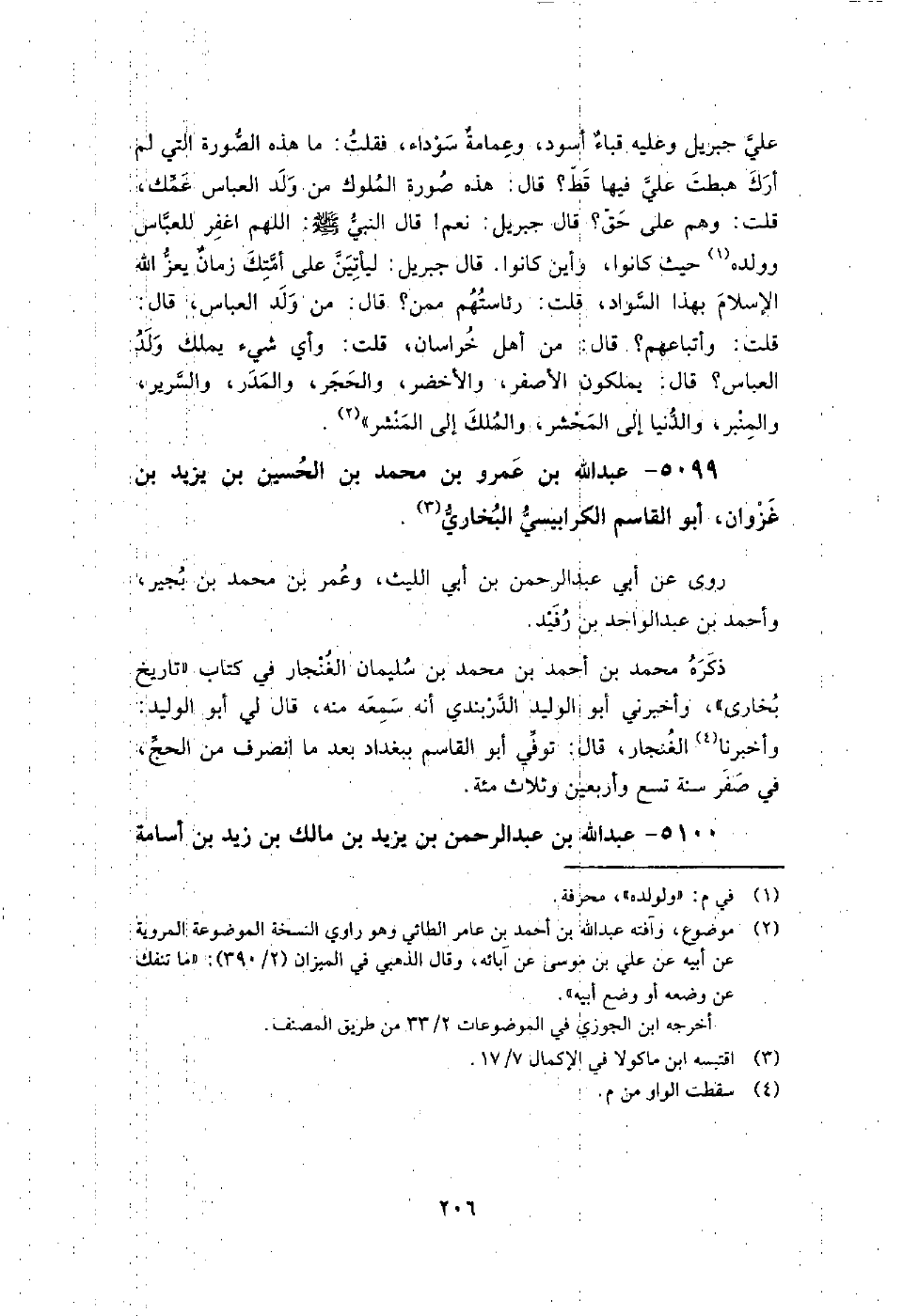 5099 - عبد اللَّه بن عمرو بن مُحَمَّد بن الْحُسَيْن بن يزيد بن غزوان أبو القاسم الكرابيسي البخاري روى عن أبي عبد الرحمن بن أبي الليث، وعمر بن مُحَمَّد بن بُجير، وأَحْمَد بن عبد الواحد بن رفيد.