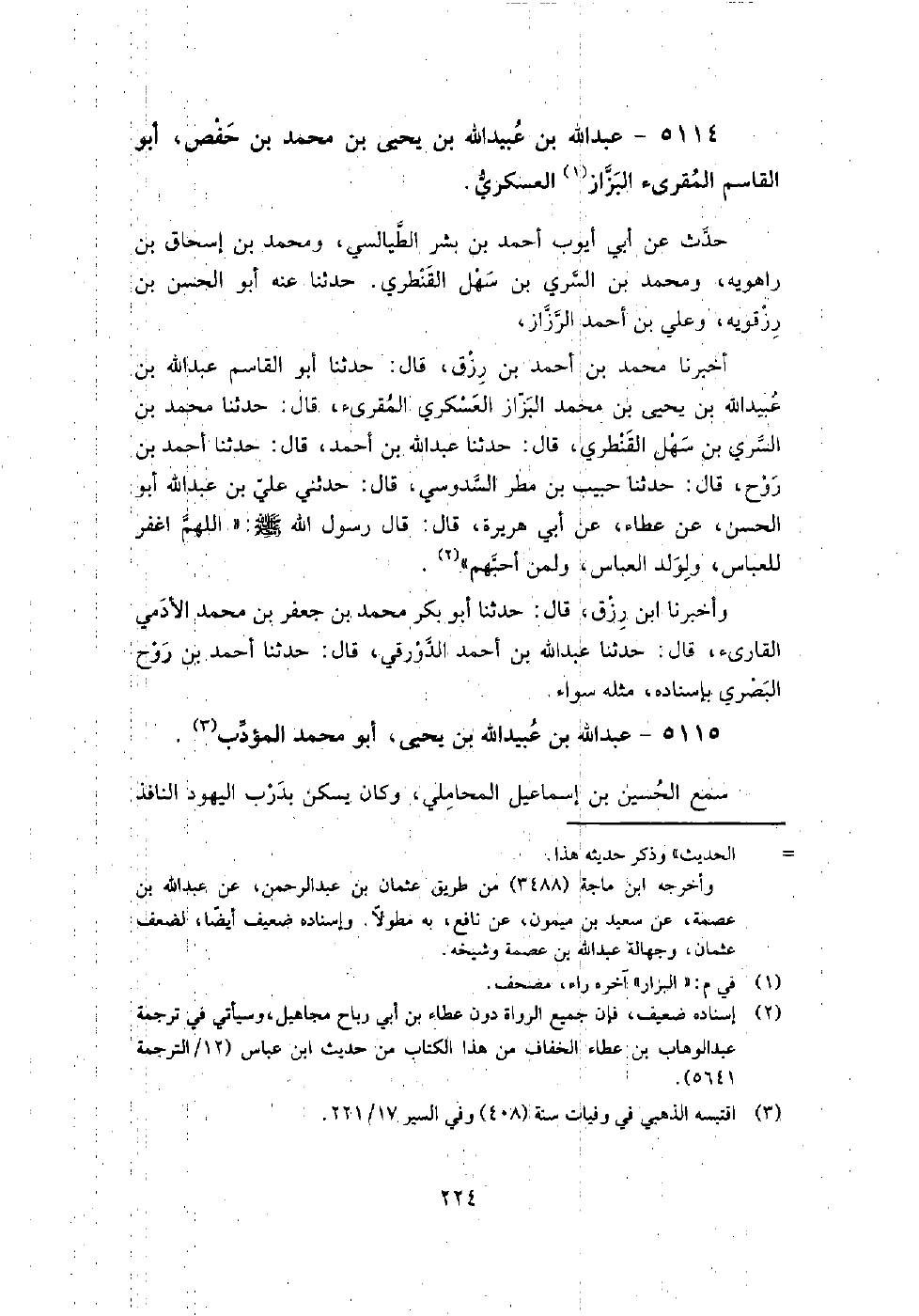 5114 - عبد اللَّه بن عبيد اللَّه بن يَحْيَى بن مُحَمَّد بن حفص أبو القاسم المقرئ البزاز العسكري حدث عن أبي أيوب أَحْمَد بن بشر الطيالسي، ومُحَمَّد بن إسحاق بن راهويه، ومُحَمَّد بن السري بن سهل القنطري.