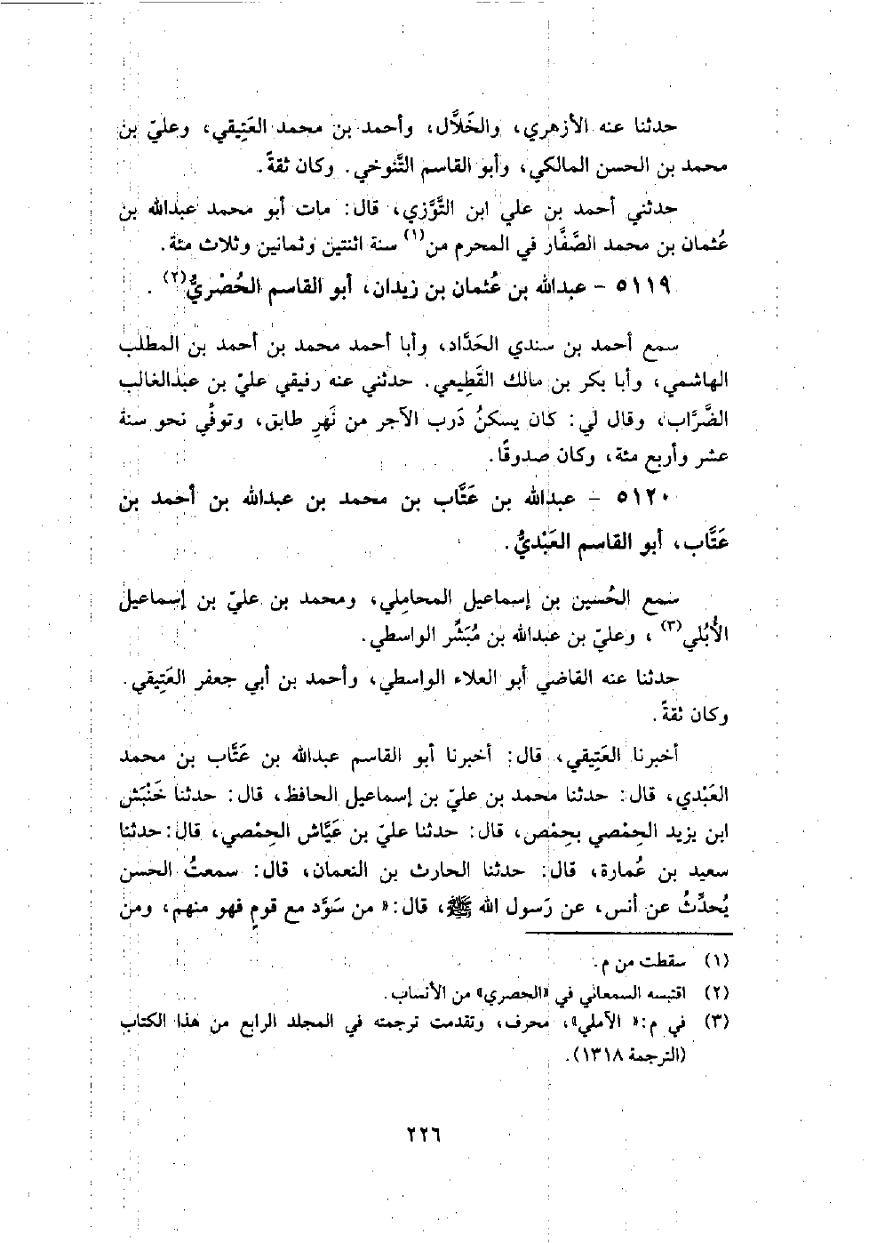 5119 - عبد اللَّه بن عثمان بن زيدان، أبو القاسم الحصري سمع أَحْمَد بن سندي الحداد، وأبا أَحْمَد مُحَمَّد بن أَحْمَد بن المطلب الهاشمي، وأبا بكر بن مالك القطيعي.