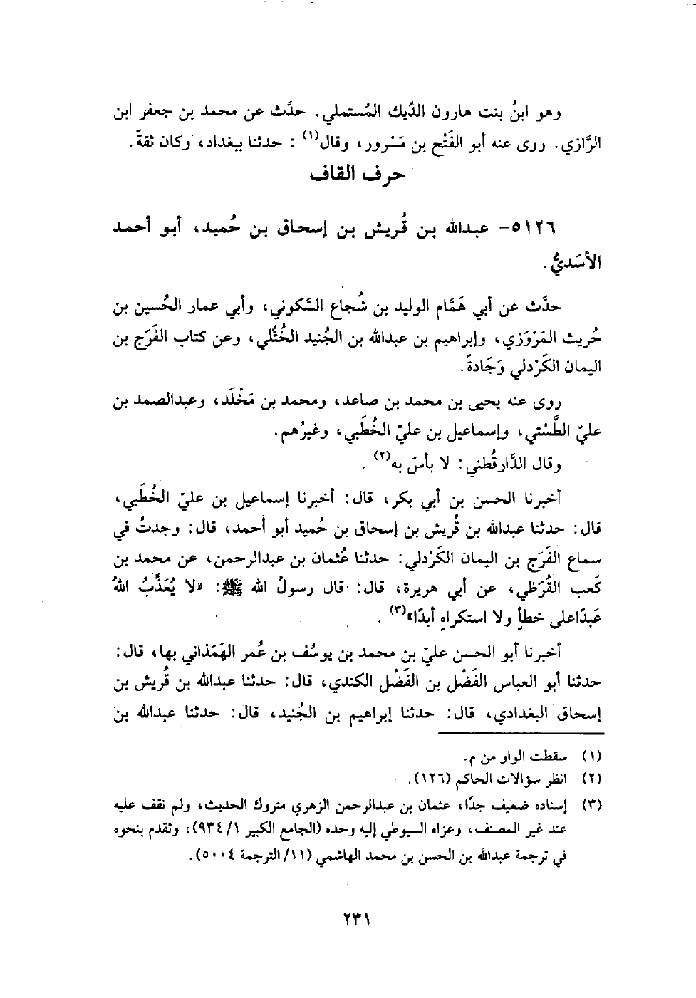 5126 - عبد اللَّه بن قريش بن إسحاق بن حميد أبو أَحْمَد الأسدي حدث عن أبي همام الوليد بن شجاع السكوني، وأبي عمار الْحُسَيْن بن حريث الْمَرْوَزِيّ، وإِبْرَاهِيم بن عبد اللَّه بن الجنيد الختلي، وعن كتاب الفرج بن اليمان الكردلي وجادة.