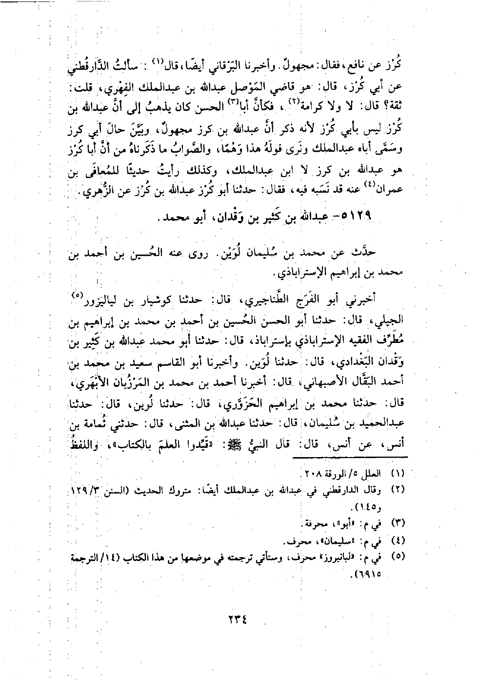 (3280) -[11: 234] أَخْبَرَنِي أَبُو الْفَرَجِ الطَّنَاجِيرِيُّ، قَالَ: حَدَّثَنَا كوشيَارُ بْنُ لياليزورَالْجِيلِيُّ، قَالَ: حَدَّثَنَا أَبُو الْحَسَنِ الْحُسَيْنُ بْنُ أَحْمَدَ بْنِ مُحَمَّدِ بْنِ إِبْرَاهِيمَ بْنِ مُطَرِّفٍ الْفَقِيهُ الإِسْتِرَابَاذِيُّ بِإِسْتِرَابَاذَ، قَالَ: حَدَّثَنَا أَبُو مُحَمَّدٍ عَبْدُ اللَّهِ بْنُ كَثِيرِ بْنِ وَقْدَانَ الْبَغْدَادِيُّ، قَالَ: حَدَّثَنَا لُوَيْنٌ.