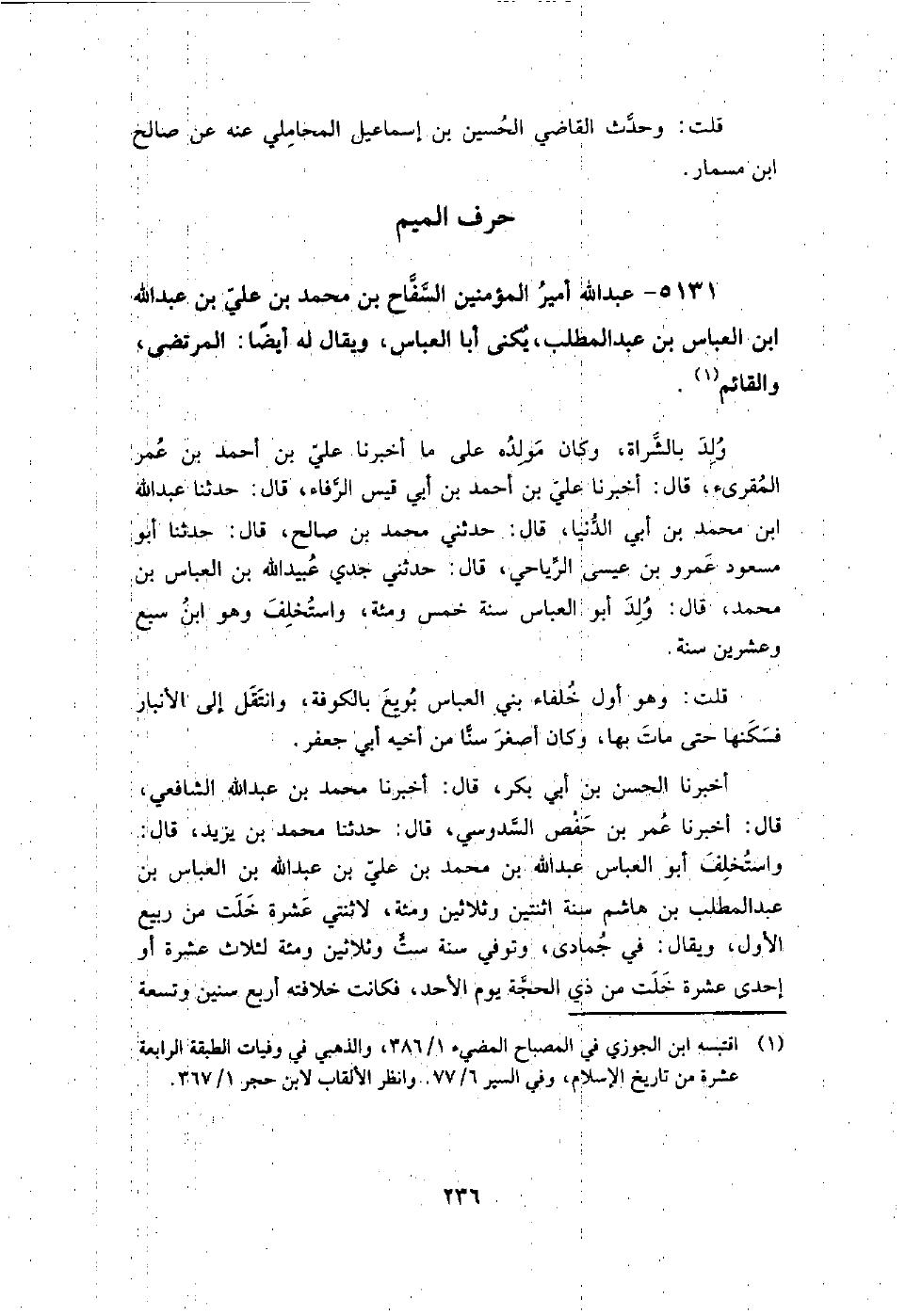 5131 - عبد اللَّه أمير المؤمنين السفاح بن مُحَمَّد بن علي بن عبد اللَّه بن العباس بن عبد المطلب يكنى أبا العباس ويقَالَ له أيضًا المرتضى والقائم.