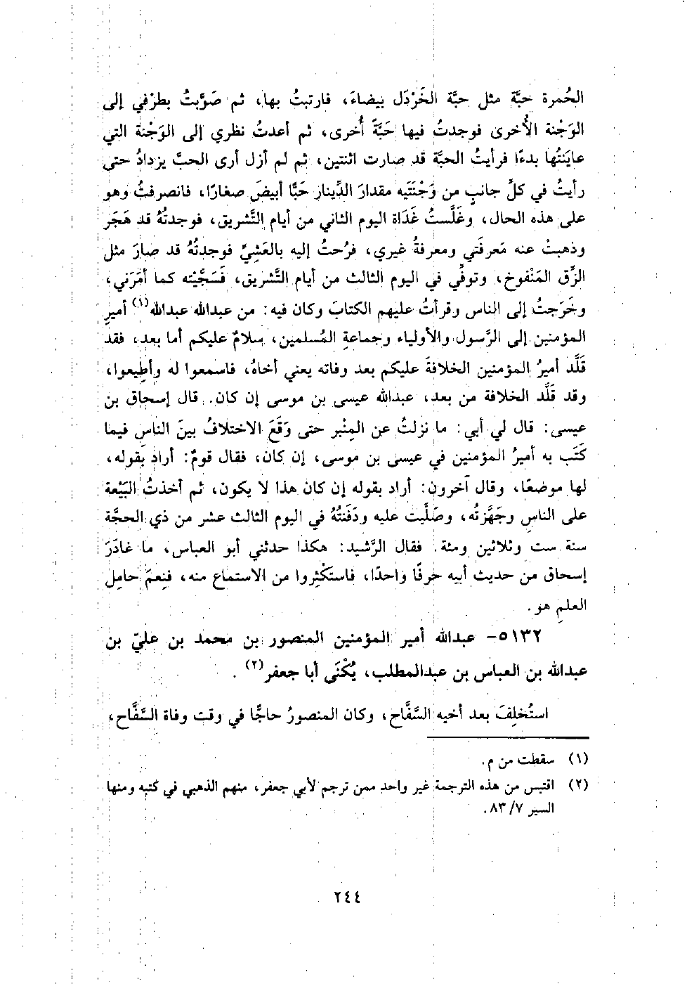5132 - عبد اللَّه أمير المؤمنين المنصور بن مُحَمَّد بن علي بن عبد اللَّه بن العباس بن عبد المطلب، يكنى أبا جعفر استخلف بعد أخيه السفاح، وكان المنصور حاجًا في وقت وفاة السفاح، فعقد له البيعة بالأنبار عمه عيسى بن علي، وورد الخبر على المنصور في أربعة عشر يومًا وكان له من السن إذ ذاك إحدى وأربعون سنة وشهور.