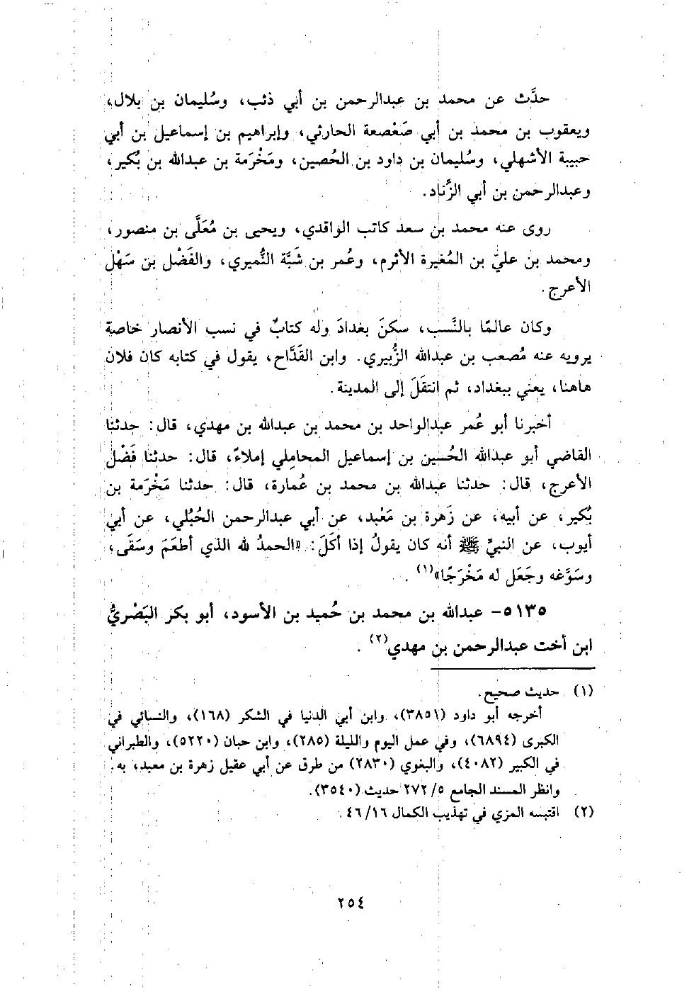 5135 - عبد اللَّه بن مُحَمَّد بن حميد بن الأسود أبو بكر البصري ابن أخت عبد الرحمن بن مهدي كان قاضي همذان، ويعرف بابن أَبِي الأسود، وأبو الأسود هو حميد جده.