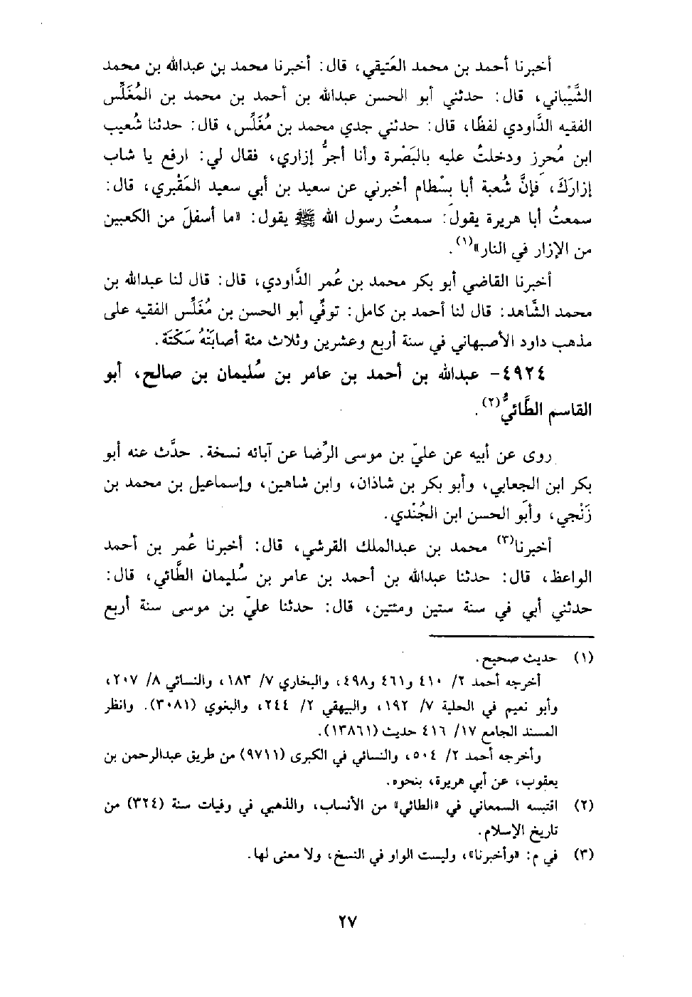 4924 - عبد الله بن أَحْمَد بن عامر بن سليمان بن صالح، أبو القاسم الطائي روى عَنْ أَبِيهِ، عن علي بن موسى الرضا، عن آبائه نسخة.