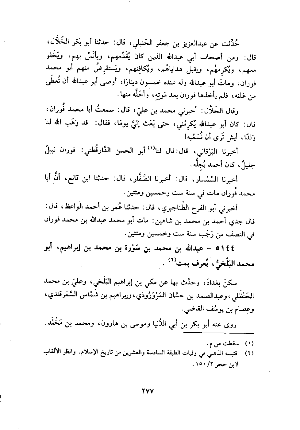 5144 - عبد اللَّه بن مُحَمَّد بن سورة بن مُحَمَّد بْنُ إِبْرَاهِيمَ أبو مُحَمَّد البلخي، يعرف بِمت سكن بغداد، وحدث بِها عن مكي بْنُ إِبْرَاهِيمَ البلخي، وعلي بن مُحَمَّد الحنظلي، وعبد الصمد بن حسان المروروذي، وإِبْرَاهِيم بن شماس السمرقندي، وعصام بن يوسف الْقَاضِي.