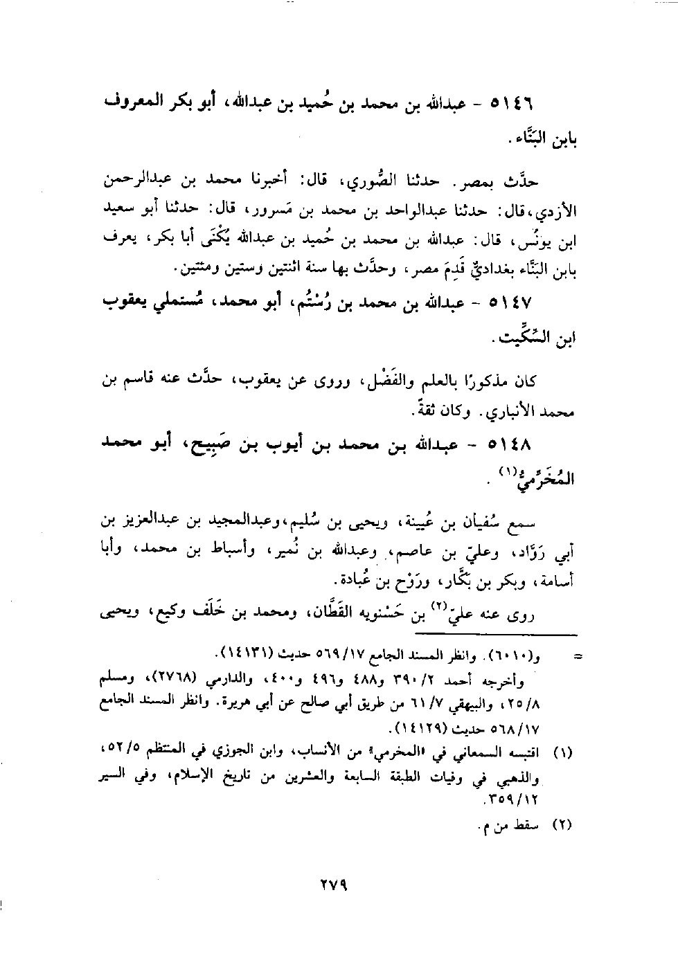 5148 - عبد اللَّه بن مُحَمَّد بن أيوب بن صبيح أبو مُحَمَّد المخرمي سَمِعَ سفيان بن عيينة، ويَحْيَى بن سليم، وعبد المجيد بن عبد العزيز بن أَبِي رواد، وعلي بن عاصم، وعبد اللَّه بن نمير، وأسباط بن مُحَمَّد، وأبا أسامة، وبكر بن بكار، وروح بن عبادة.