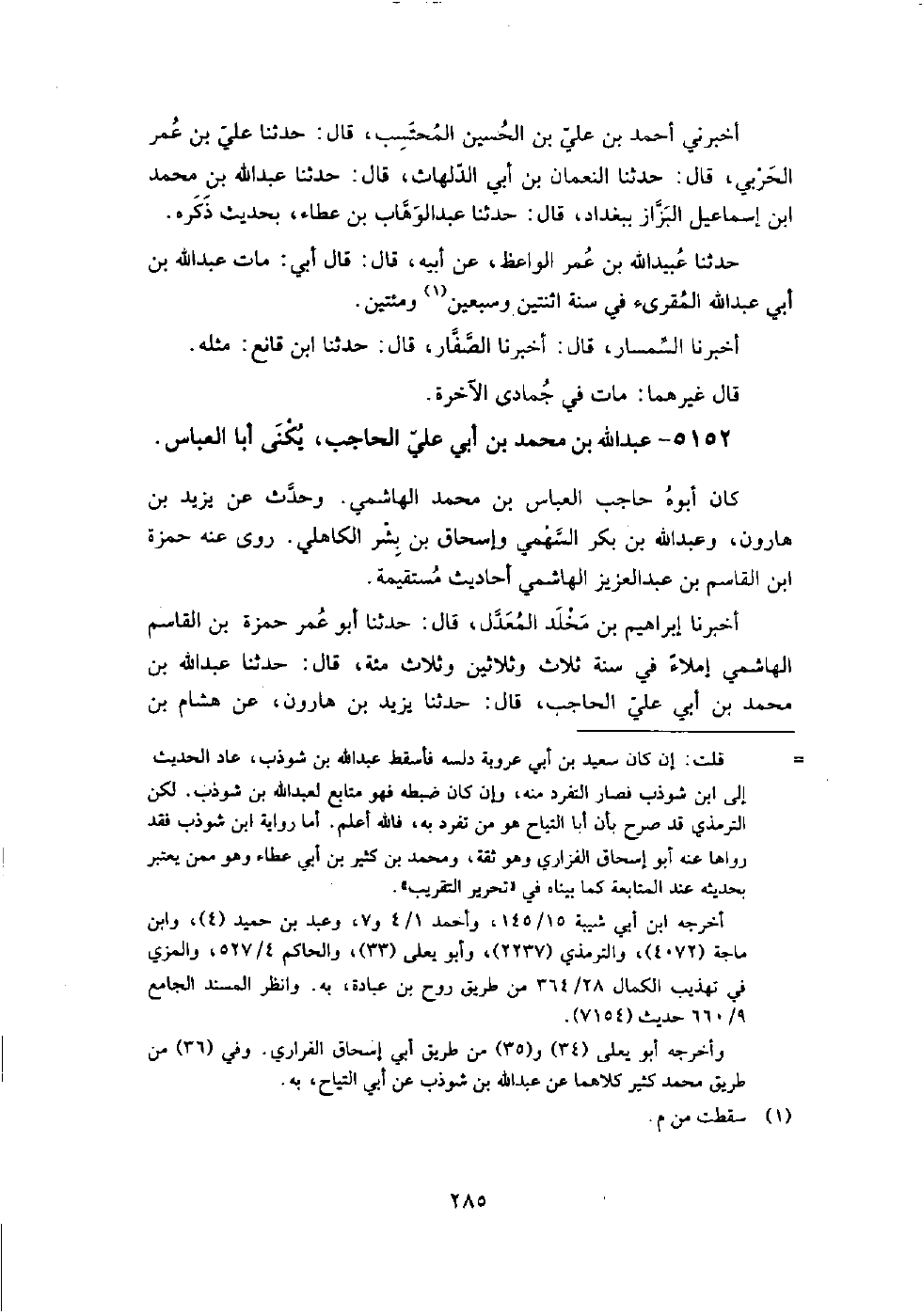 5152 - عبد اللَّه بن مُحَمَّد بن أبي علي الحاجب، يكنى أبا العباس كان أبوه حاجب العباس بن مُحَمَّد الهاشمي.