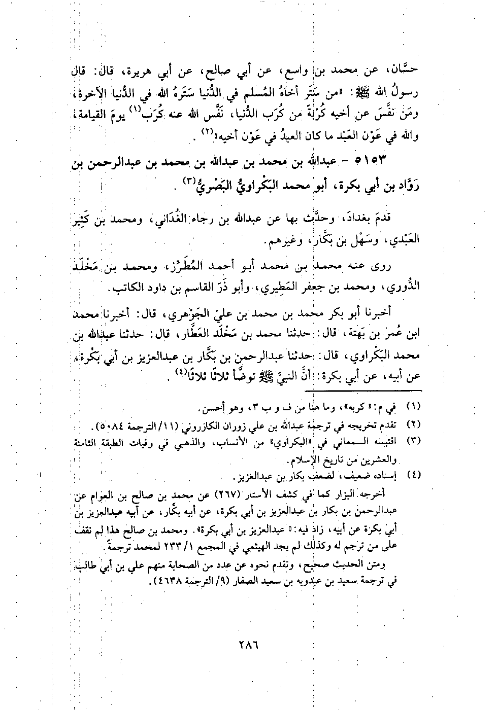 5153 - عبد اللَّه بن مُحَمَّد بن عبد اللَّه بن مُحَمَّد بن عبد الرحمن بن رواد بن أبي بكرة أبو مُحَمَّد البكراوي البصري قدم بغداد، وحدث بِها عن عبد اللَّه بن رجاء الغداني، ومُحَمَّد بن كثير العبدي، وسهل بن بكار، وغيرهم.