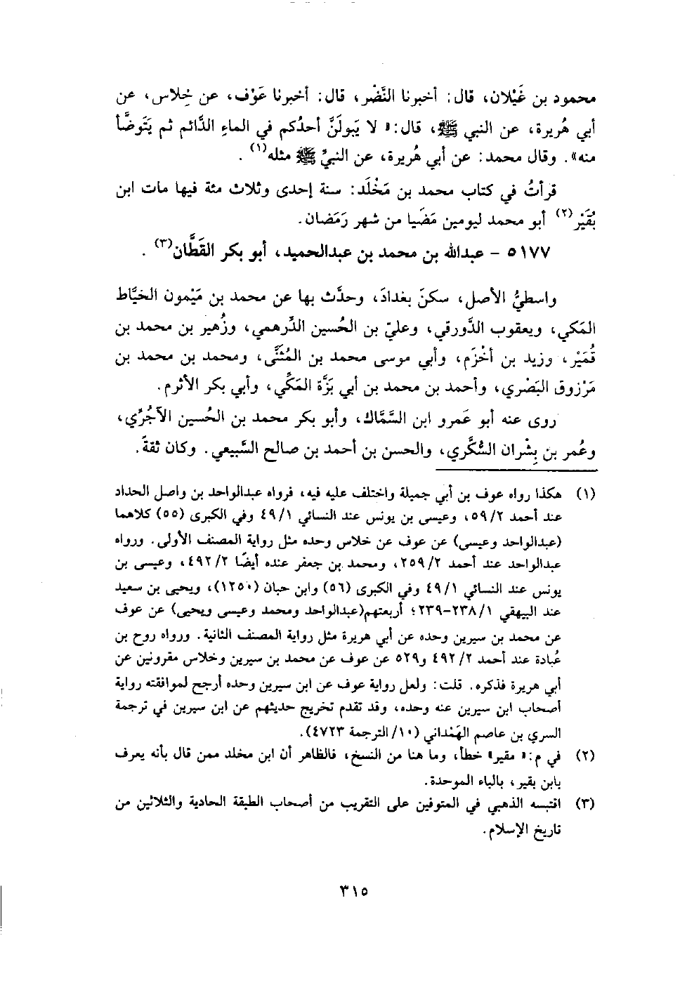 5177 - عبد اللَّه بن مُحَمَّد بن عبد الحميد أبو بكر القطان واسطي الأصل، سكن بغداد، وحدث بِها عن مُحَمَّد بن ميمون الخياط المكي، ويعقوب الدورقي، وعلي بن الْحُسَيْن الدرهمي، وزهير بن مُحَمَّد بن قمير، وزيد بن أخزم، وأبي موسى مُحَمَّد بن المثنى، ومُحَمَّد بن مُحَمَّد بن مرزوق البصري، وأَحْمَد بن مُحَمَّد بن أبي برة المكي، وأبي بكر الأثرم.