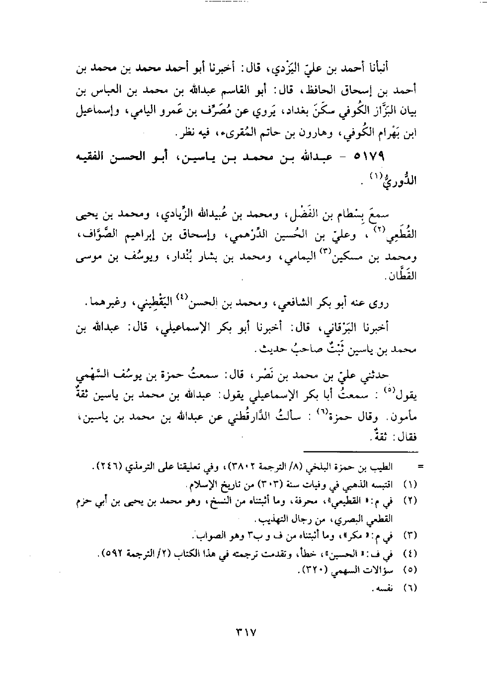 5179 - عبد اللَّه بن مُحَمَّد بن ياسين أبو الْحَسَن الفقيه الدوري سمع بسطام بن الفضل، ومُحَمَّد بن عبيد اللَّه الزيادي، ومُحَمَّد بن يَحْيَى القطعي، وعلي بن الْحُسَيْن الدرهمي، وإسحاق بْنُ إِبْرَاهِيمَ الصواف، ومُحَمَّد بن مسكين اليمامي، ومُحَمَّد بن بشار بندار، ويوسف بن موسى القطان.