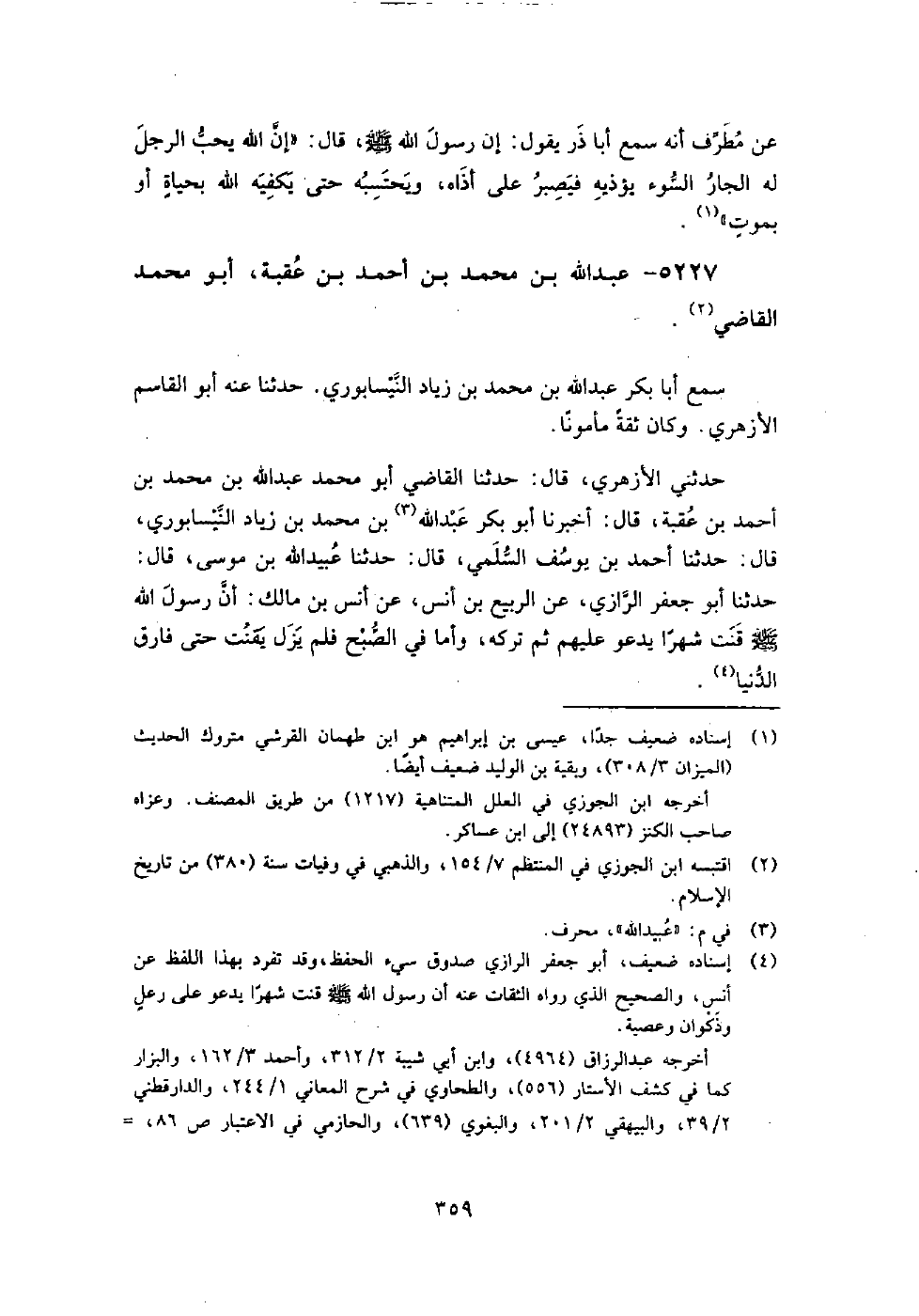 5227 - عبد اللَّه بن مُحَمَّد بن أَحْمَد بن عقبة، أبو مُحَمَّد الْقَاضِي سَمِعَ أبا بكر عبد اللَّه بن مُحَمَّد بن زياد النيسابوري.