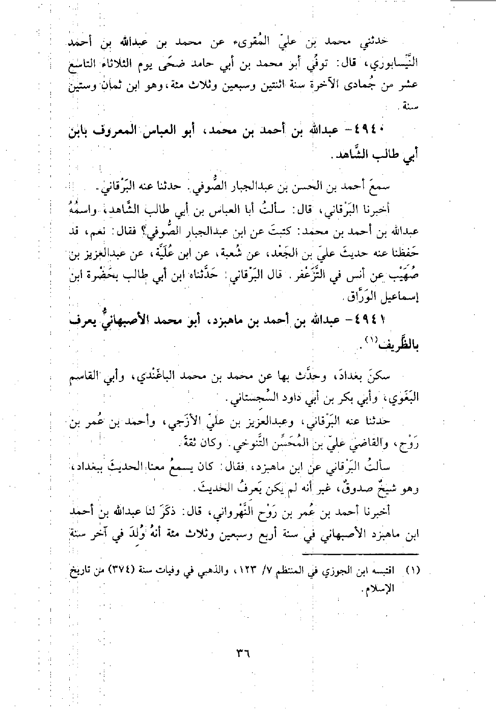 4940 - عبد الله بن أَحْمَد بن مُحَمَّد، أبو العباس المعروف بابن أبي طالب الشاهد سَمِعَ أَحْمَد بن الْحَسَن بن عبد الجبار الصوفي.