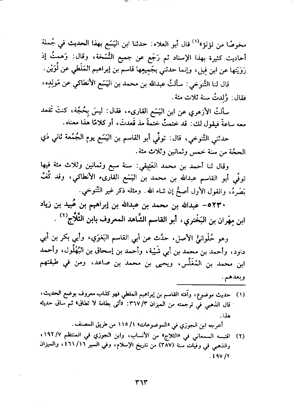 5230 - عبد اللَّه بن مُحَمَّد بن عبد اللَّه بْنُ إِبْرَاهِيمَ بن عبيد بن زياد بن مهران بن البختري أبو القاسم الشاهد المعروف بابن الثلاج