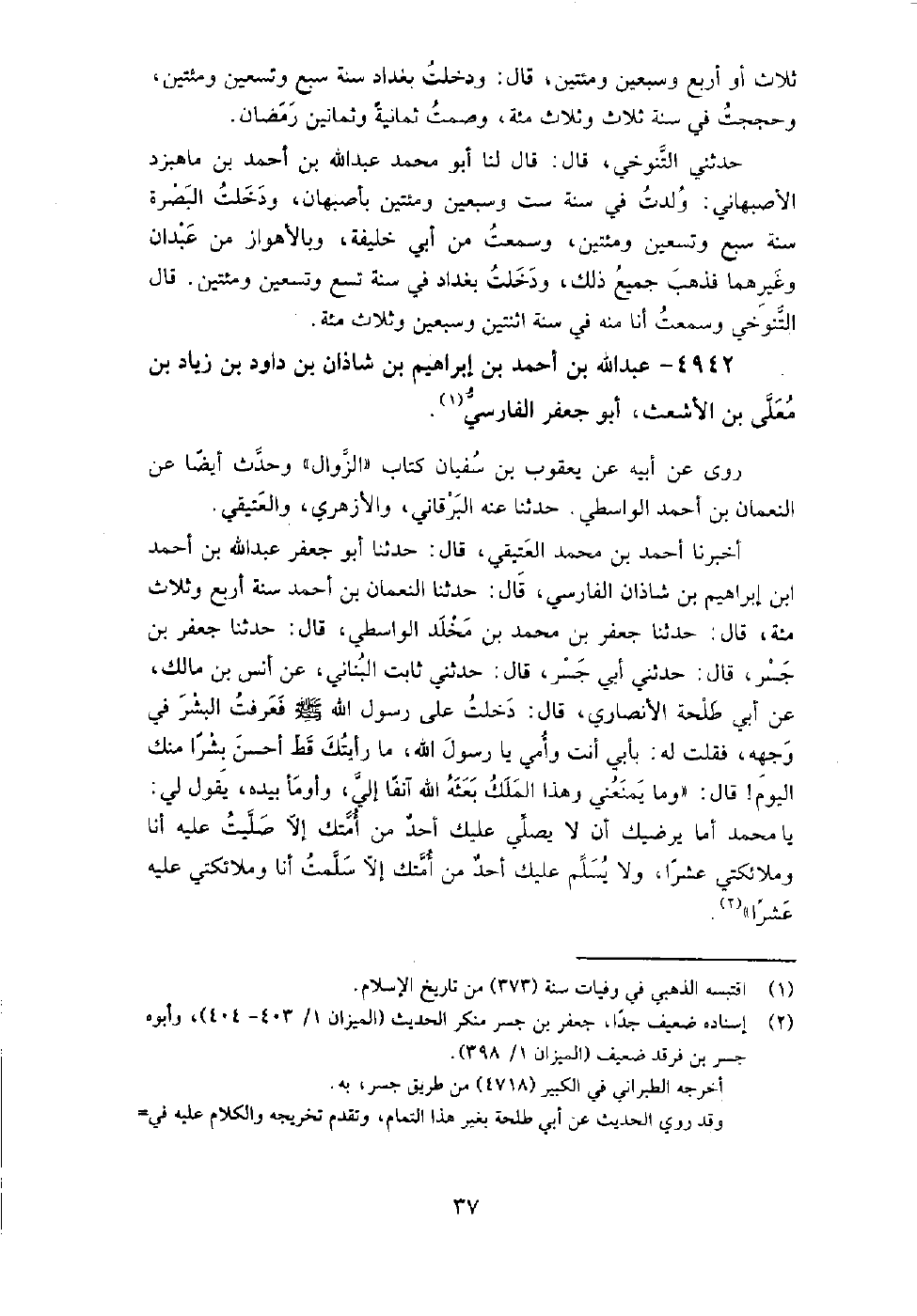 (3188) -[11: 37] أخبرنا أَحْمَدُ بْنُ مُحَمَّدٍ الْعَتِيقِيُّ، قَالَ: حَدَّثَنَا أَبُو جَعْفَرَ عَبْدُ اللَّهِ بْنُ أَحْمَدَ بْنِ إِبْرَاهِيمَ بْنِ شَاذَانَ الْفَارِسِيُّ، قَالَ: حَدَّثَنَا النُّعْمَانُ بْنُ أَحْمَدَ سَنَةَ أَرْبَعٍ وَثَلاثِ مِائَةٍ، قَالَ: حَدَّثَنَا جَعْفَرُ بْنُ مُحَمَّدِ بْنِ مَخْلَدٍ الْوَاسِطِيُّ، قَالَ: حَدَّثَنَا جَعْفَرُ بْنُ جَسْرٍ، قَالَ: حَدَّثَنِي أَبِي جَسْرٍ، قَالَ: حَدَّثَنِي ثَابِتٌ الْبُنَانِيُّ، عَنْ أَنَسِ بْنِ مَالِكٍ، عَنْ أَبِي طَلْحَةَ الأَنْصَارِيِّ، قَالَ: دَخَلْتُ عَلَى رَسُولِ اللَّهِ صَلَّى اللَّهُ عَلَيْهِ وَسَلَّمَ فَعَرَفْتُ الْبِشْرَ فِي وَجْهِهِ، فَقُلْتُ لَهُ: بِأَبِي أَنْتَ وَأُمِّي يَا رَسُولَ اللَّهِ، مَا رَأَيْتُكَ قَطُّ أَحْسَنَ بِشْرًا مِنْكَ الْيَوْمَ! قَالَ: " وَمَا يَمْنَعُنِي وَهَذَا الْمَلَكُ بَعَثَهُ اللَّهُ آنِفًا إِلَيَّ، وَأَوْمَأَ بِيَدِهِ، يَقُولُ لِي: يَا مُحَمَّدُ، أَمَا يُرْضِيكَ أَنْ لا يُصَلِّي عَلَيْكَ أَحَدٌ مِنْ أُمَّتِكَ إِلا صَلَّيْتُ عَلَيْهِ أَنَا وَمَلائِكَتِي عَشْرًا، وَلا يُسَلِّمُ عَلَيْكَ أَحَدٌ مِنْ أُمَّتِكَ إِلا سَلَّمْتُ أَنَا وَمَلائِكَتِي عَلَيْهِ عَشْرًا " قَالَ لي الأزهري سمعت من أَبِي جعفر بن شاذان الفارسي في منزلنا في سنة ثلاث وسبعين وثلاث مائة، قلت: فكيف حاله؟ قَالَ: ثقة.