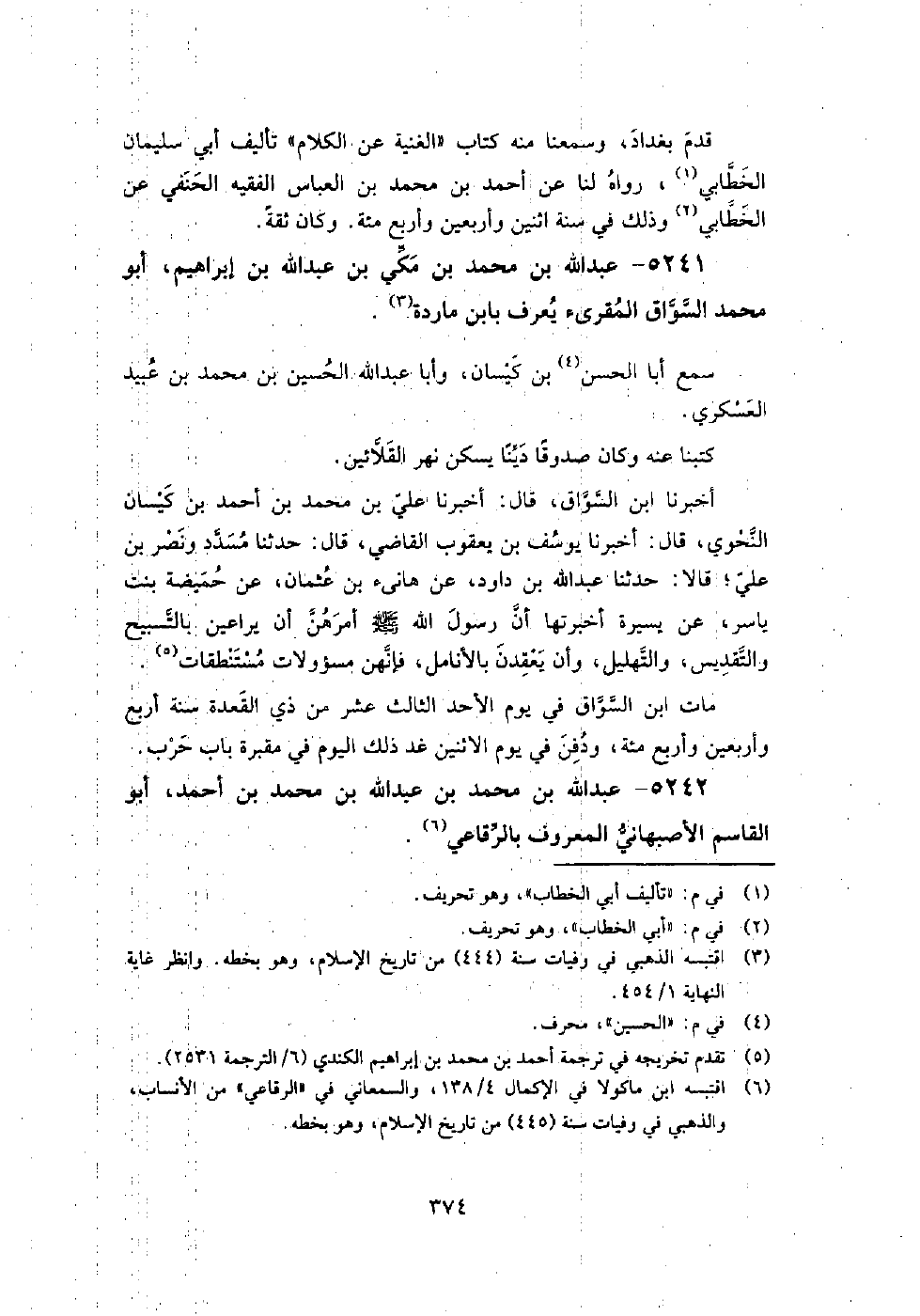 5242 - عبد اللَّه بن مُحَمَّد بن عبد اللَّه بن مُحَمَّد بن أَحْمَد أبو القاسم الأصبهاني المعروف بالرقاعي سمع بأصبهان أبا بكر أَحْمَد بن موسى بن مردويه، ونَحوه، وبالبصرة الْقَاضِي أبا عمر بن عبد الواحد الهاشمي، وببغداد جَماعة من هذه الطبقة.