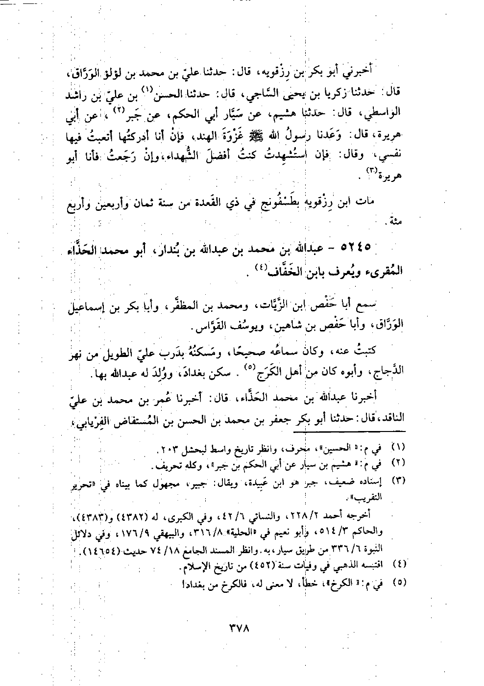 5245 - عبد اللَّه بن مُحَمَّد بن عبد اللَّه بن بندار أبو مُحَمَّد الحذاء المقرئ ويعرف بابن الخفاف سمع أبا حفص ابن الزيات، ومُحَمَّد بن المظفر، وأبا بكر بن إِسْمَاعِيل الوراق، وأبا حفص بن شاهين، ويوسف القواس.