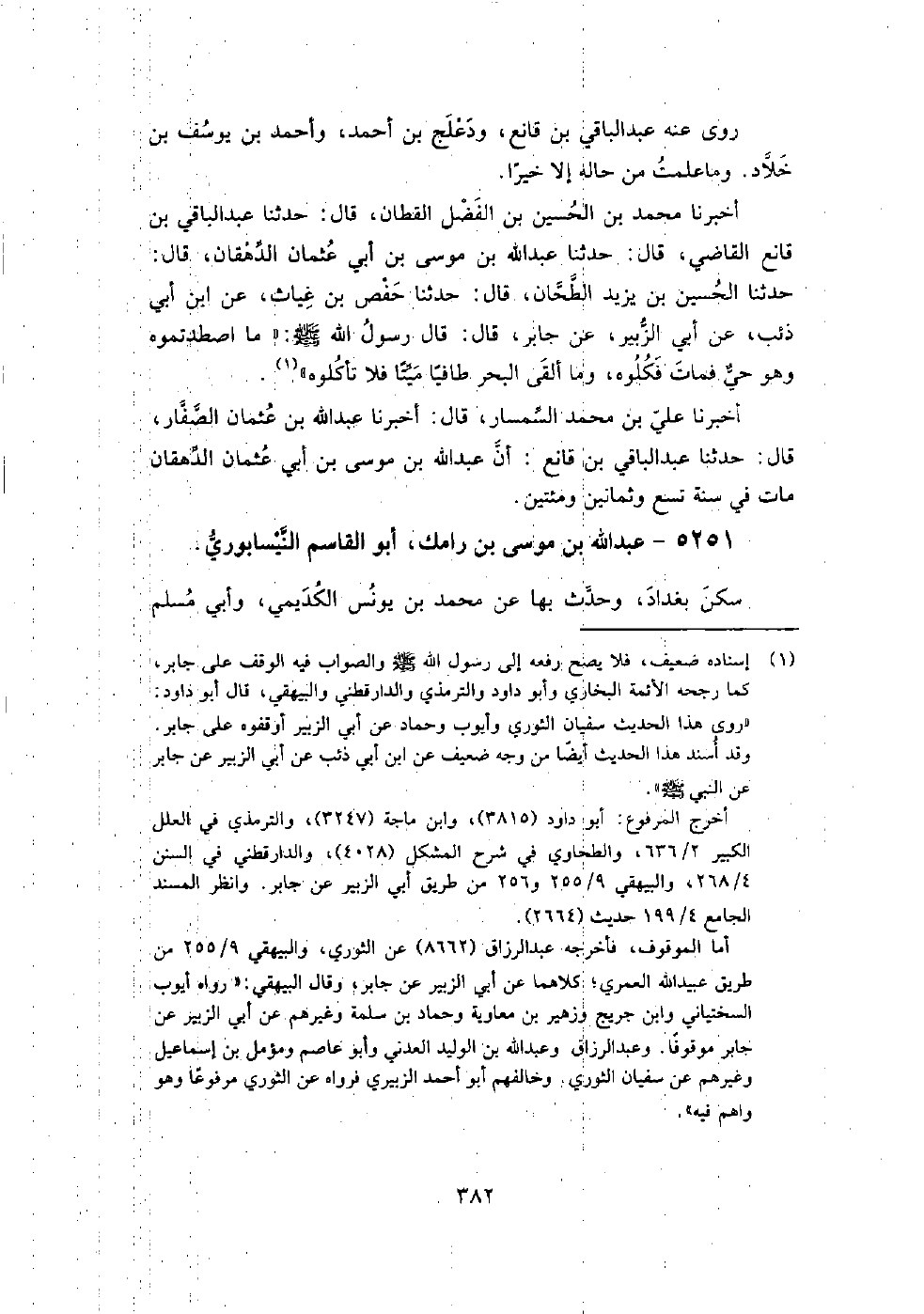 5251 - عبد اللَّه بن موسى بن رامك أبو القاسم النيسابوري سكن بغداد، وحدث بِها عن مُحَمَّد بن يونس الكديمي، وأبي مسلم الكجي، وأَحْمَد بن علي الْخزاز، وعبد اللَّه بن أَحْمَد بن حنبل.