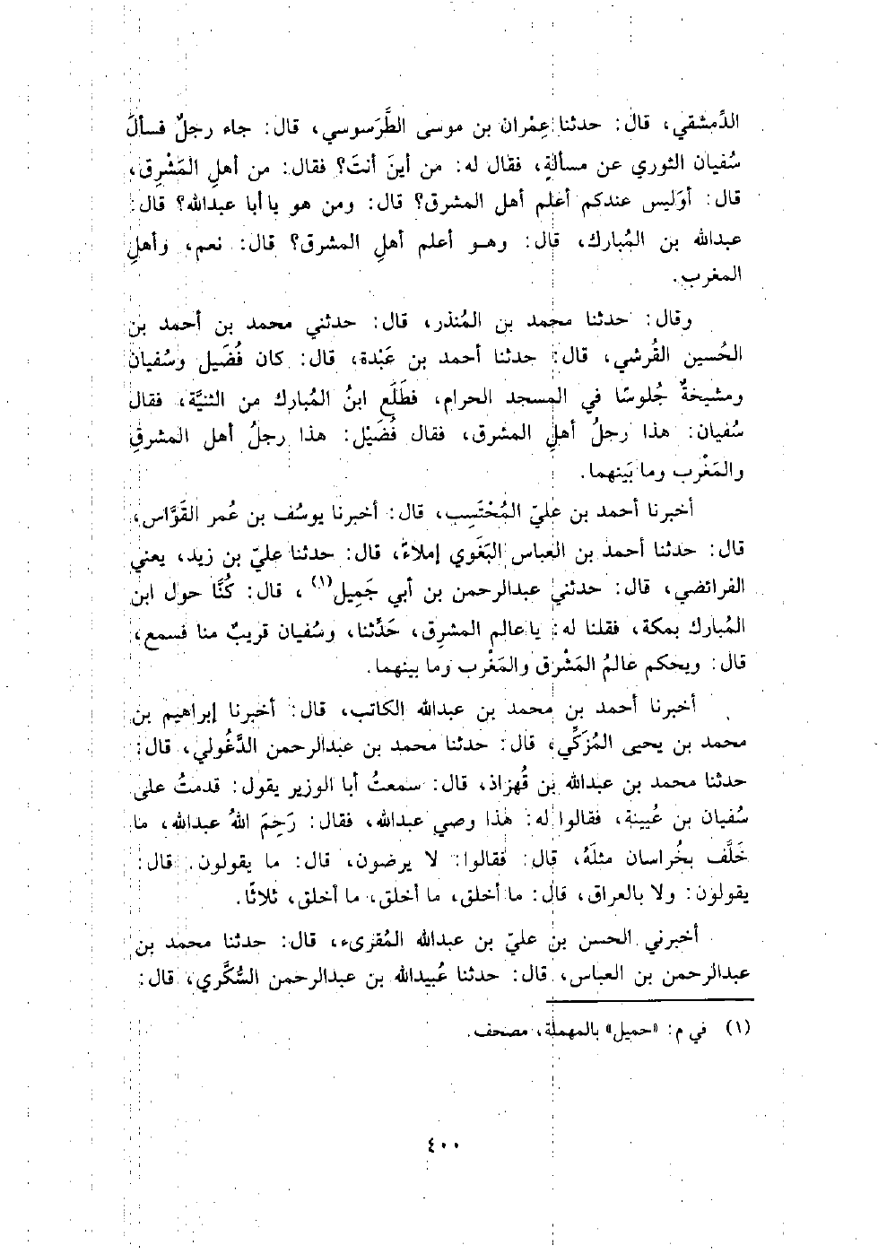 الدمشقي، قَالَ: حَدَّثَنَا عمران بن موسى الطرطوسي، قَالَ: جاء رجل، فسأل سفيان الثوري عن مسألة، فقَالَ له: من أين أنت؟ فقَالَ: من أهل المشرق، قَالَ: أو ليس عندكم أعلم أهل المشرق؟ قَالَ: ومن هو يا أبا عبد اللَّه؟ قَالَ: عبد اللَّه بن المبارك، قَالَ: وهو أعلم أهل المشرق؟ قَالَ: نعم، وأهل المغرب.