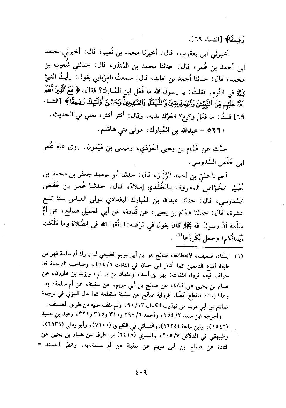 (3363) -[11: 409] أَخْبَرَنَا عَلِيُّ بْنُ أَحْمَدَ الرَّزَّازُ، قَالَ: حَدَّثَنَا أَبُو مُحَمَّدٍ جَعْفَرُ بْنُ مُحَمَّدِ بْنِ نُصَيْرٍ الْخَوَّاصُ، الْمَعْرُوفِ بِالْخُلْدِيِّ إِمْلاءً، قَالَ: حَدَّثَنَا عُمَرُ بْنُ حَفْصٍ السَّدُوسِيُّ، قَالَ: حَدَّثَنَا عَبْدُ اللَّهِ بْنُ الْمُبَارَكِ الْبَغْدَادِيُّ، مَوْلَى الْعَبَّاسِ سَنَةَ تِسْعَ عَشْرَةَ، قَالَ: حَدَّثَنَا هَمَّامُ بْنُ يَحْيَى، عَنْ قَتَادَةَ، عَنْ أَبِي الْخَلِيلِ صَالِحٍ، عَنْ أُمِّ سَلَمَةَ، أَنَّ رَسُولَ اللَّهِ صَلَّى اللَّهُ عَلَيْهِ وَسَلَّمَ كَانَ يَقُولُ فِي مَرَضِهِ: " اتَّقُوا اللَّهُ فِي الصَّلاةِ وَمَا مَلَكَتْ أَيْمَانُكُمْ "، وَجَعَلَ يُكَرِّرُهَا وحدث عن هذا الشيخ أَحْمَد بن القاسم بن مساور الجوهري، فَقَالَ: حَدَّثَنَا عبد اللَّه بن المبارك الخراساني ببغداد في مسجد الجامع، قَالَ: حَدَّثَنَا همام بن يَحْيَى.