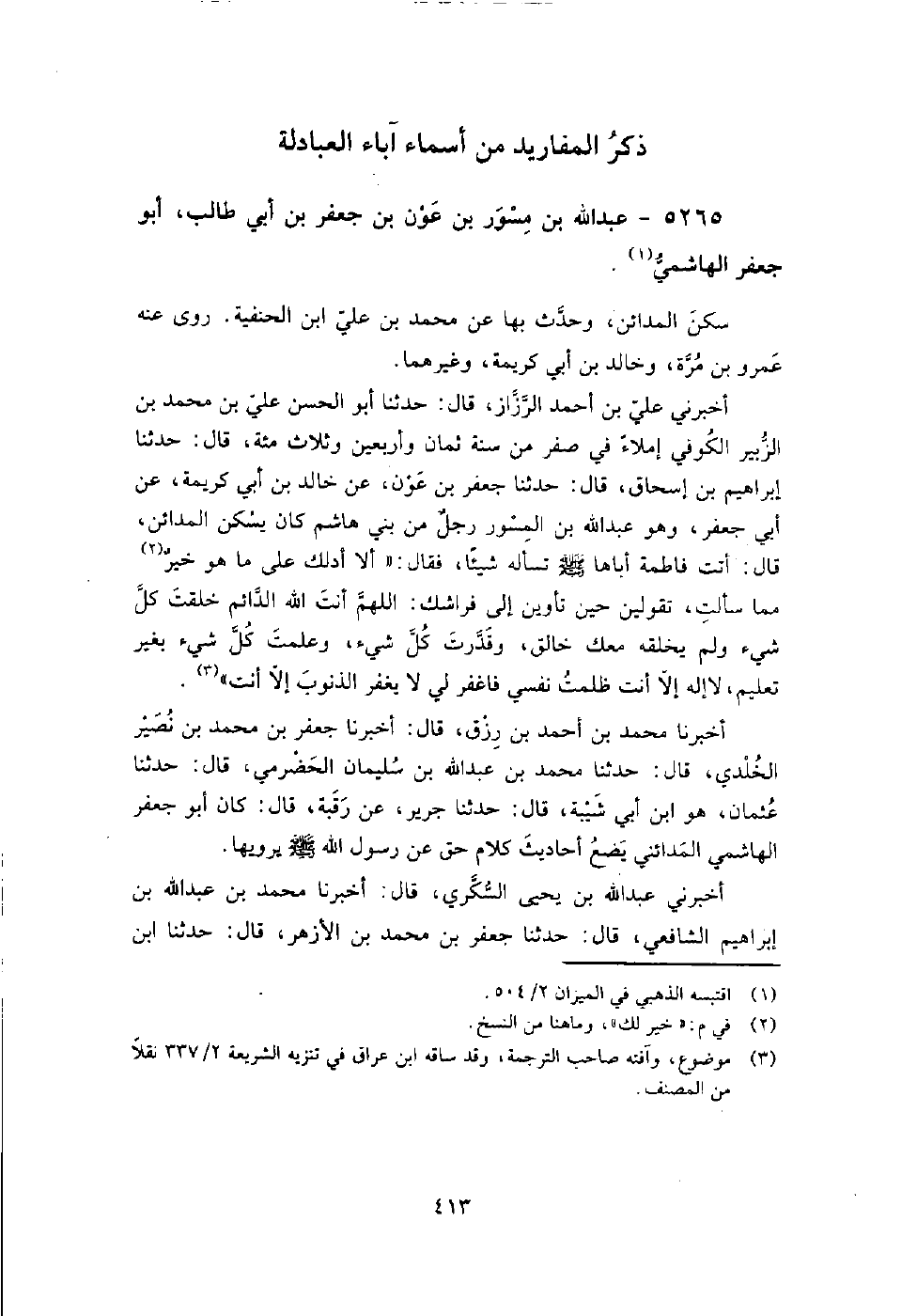 (3365) -[11: 413] أَخْبَرَنِي عَلِيُّ بْنُ أَحْمَدَ الرَّزَّازُ، قَالَ: حَدَّثَنَا أَبُو الْحَسَنِ عَلِيُّ بْنُ مُحَمَّدِ بْنِ الزُّبَيْرِ الْكُوفِيُّ، إِمْلاءً فِي صَفَرٍ مِنْ سَنَةِ ثَمَانٍ وَأَرْبَعِينَ وَثَلاثِ مِائَةٍ، قَالَ: حَدَّثَنَا إِبْرَاهِيمُ بْنُ إِسْحَاقَ، قَالَ: حَدَّثَنَا جَعْفَرُ بْنُ عَوْنٍ، عَنْ خَالِدِ بْنِ أَبِي كَرِيمَةَ، عَنْ أَبِي جَعْفَرٍ وَهُوَ عَبْدُ اللَّهِ بْنُ الْمِسْوَرِ رَجُلٌ مِنْ بَنِي هَاشِمٍ كَانَ يَسْكُنُ الْمَدَائِنِ، قَالَ: أَتَتْ فَاطِمَةَ أَبَاهَا صَلَّى اللَّهُ عَلَيْهِ وَسَلَّمَ تَسْأَلُهُ شَيْئًا، فَقَالَ: " أَلا أَدُلُّكَ عَلَى مَا هُوَ خَيْرٌ مِمَّا سَأَلْتَ، تَقُولِينَ حِينَ تَأْوِينَ إِلَى فِرَاشِكِ: اللَّهُمَّ أَنْتَ اللَّهُ الدَّائِمُ، خَلَقْتَ كُلَّ شَيْءٍ وَلَمْ يَخْلُقْهُ مَعَكَ خَالِقُ، وَقَدَّرْتَ كُلَّ شَيْءٍ، وَعَلِمْتَ كُلَّ شَيْءٍ بِغَيْرِ تَعْلِيمٍ، لا إِلَهَ إِلا أَنْتَ، ظَلَمْتُ نَفْسِي فَاغْفِرْ لِي لا يَغْفِرُ الذُّنُوبَ إِلا أَنْتَ " أَخْبَرَنَا مُحَمَّدُ بْنُ أَحْمَدَ بْنِ رِزْقٍ، قَالَ: أَخْبَرَنَا جَعْفَرُ بْنُ مُحَمَّدِ بْنِ نُصَيْرٍ الْخَلَدِيُّ، قَالَ: حَدَّثَنَا مُحَمَّدُ بْنُ عَبْدِ اللَّهِ بْنِ سُلَيْمَانَ الْحَضْرَمِيُّ، قَالَ: حَدَّثَنَا عُثْمَانُ، هُوَ ابْنُ أَبِي شَيْبَةَ، قَالَ: حَدَّثَنَا جَرِيرٌ، عَنْ رَقَبَةَ، قَالَ: كَانَ أَبُو جَعْفَرٍ الْهَاشِمِيُّ الْمَدَائِنِيُّ يَضَعُ أَحَادِيثَ كَلامٍ حَقٍّ عَنْ رَسُولِ اللَّهِ صَلَّى اللَّهُ عَلَيْهِ وَسَلَّمَ يَرْوِيهَا.