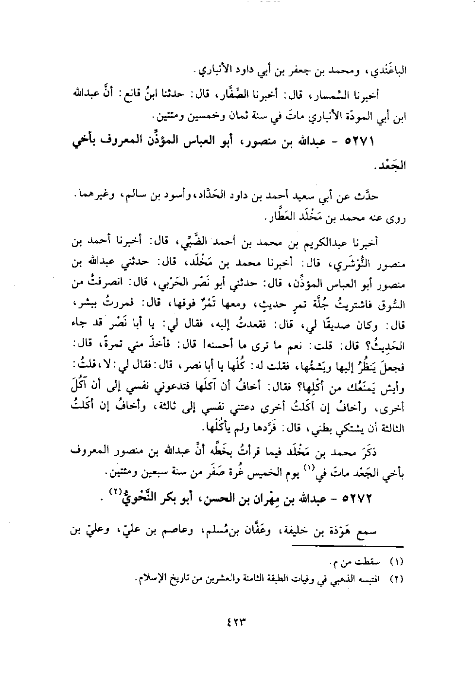 5271 - عبد اللَّه بن منصور أبو العباس المؤذن المعروف بأخي الجعد حدث عن أبي سعيد أَحْمَد بن داود الحداد، وأسود بن سالم، وغيرهما.