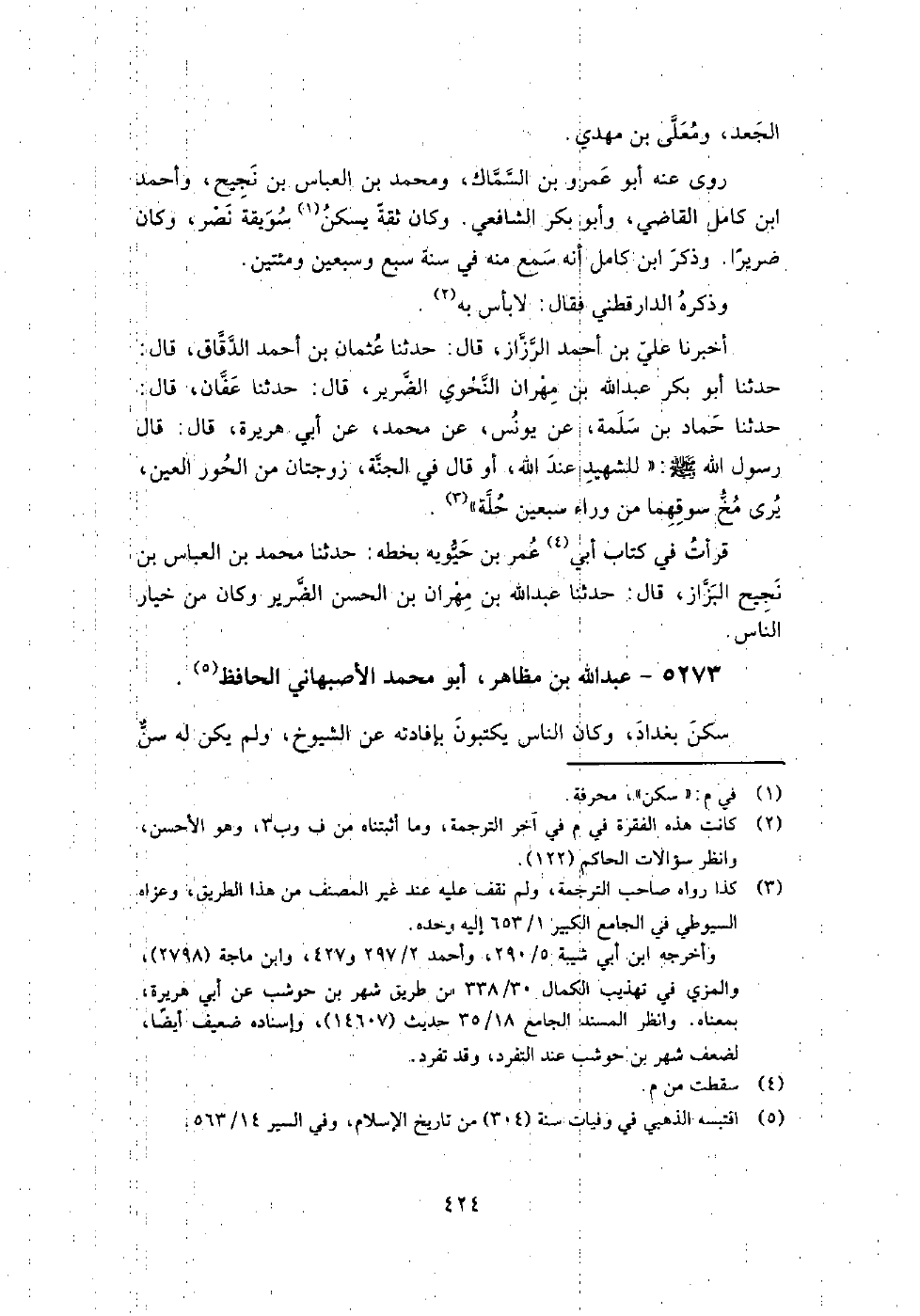 5273 - عبد اللَّه بن مظاهر أبو مُحَمَّد الأصبهاني الحافظ سكن بغداد، وكان الناس يكتبون بإفادته عن الشيوخ، ولم يكن له سن عالية.