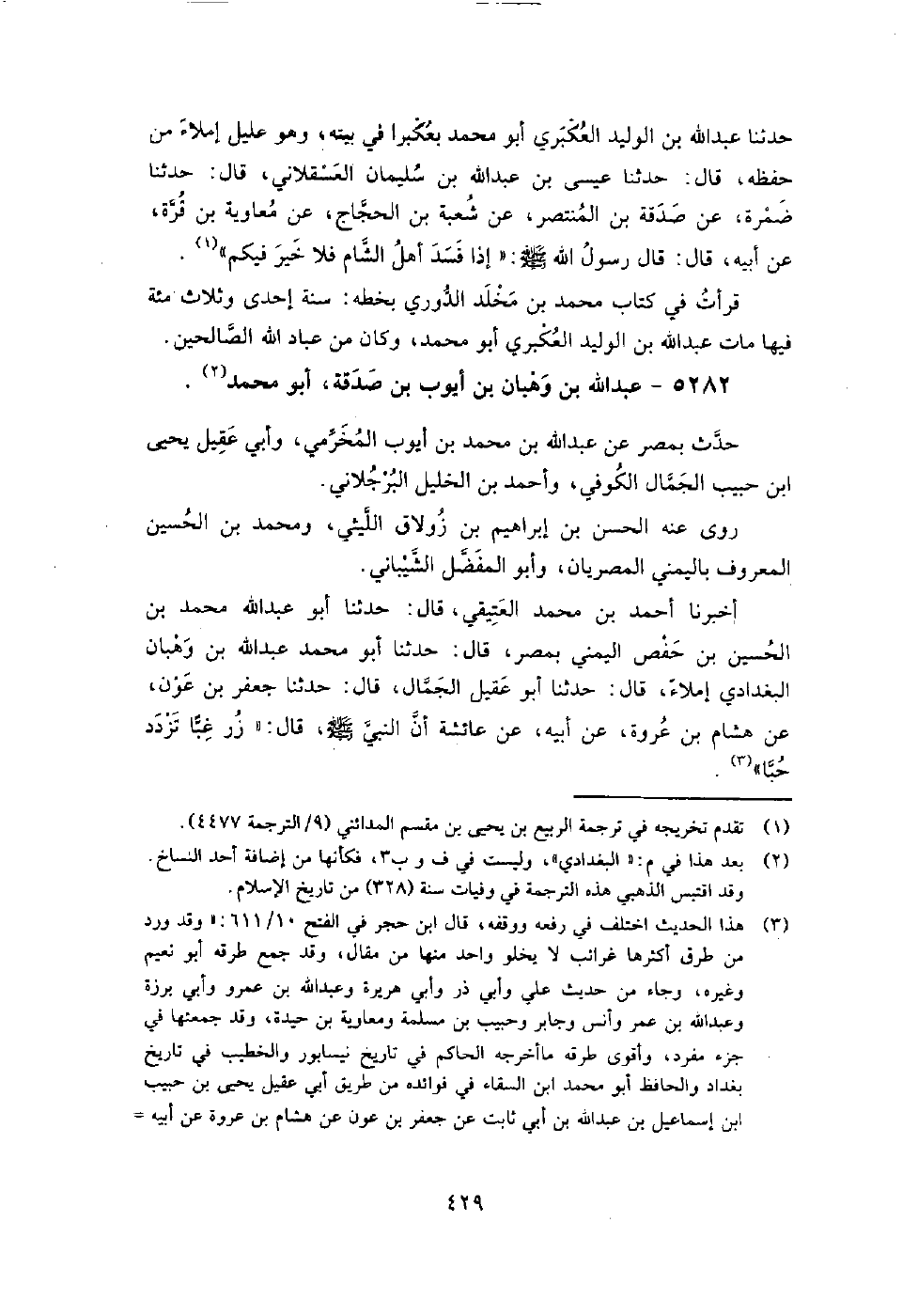 (3374) -[11: 429] أَخْبَرَنَا أَحْمَدُ بْنُ مُحَمَّدٍ الْعَتِيقِيُّ، قَالَ: حَدَّثَنَا أَبُو عَبْدِ اللَّهِ مُحَمَّدُ بْنُ الْحُسَيْنِ بْنِ حَفْصٍ الْيَمَنِيُّ، بِمِصْرَ، قَالَ: حَدَّثَنَا أَبُو مُحَمَّدٍ عَبْدُ اللَّهِ بْنُ وَهْبَانَ الْبَغْدَادِيُّ، إِمْلاءً، قَالَ: حَدَّثَنَا أَبُو عُقَيْلٍ الْجَمَّالُ، قَالَ: حَدَّثَنَا جَعْفَرُ بْنُ عَوْنٍ، عَنْ هِشَامِ بْنِ عُرْوَةَ، عَنْ أَبِيهِ، عَنْ عَائِشَةَ، أَنَّ النَّبِيَّ صَلَّى اللَّهُ عَلَيْهِ وَسَلَّمَ قَالَ: " زُرْ غِبًّا تَزْدَدْ حُبًّا " حَدَّثَنَا مُحَمَّد بن علي الصوري لفظًا، قَالَ: أَخْبَرَنَا مُحَمَّد بن عبد الرحمن الأزدي، قَالَ: حَدَّثَنَا عبد الواحد بن مُحَمَّد بن مسرور، قَالَ: حَدَّثَنَا أبو سعيد بن يونس، قَالَ: عبد اللَّه بن وهبان بن أيوب بن صدقة، يكنى أبا مُحَمَّد، بغدادي قدم مصر، وأقام بِها وحدث، وتوفي بِها في العشر الأواخر من رجب سنة ثمان وعشرين وثلاث مائة، وكان ثقة.