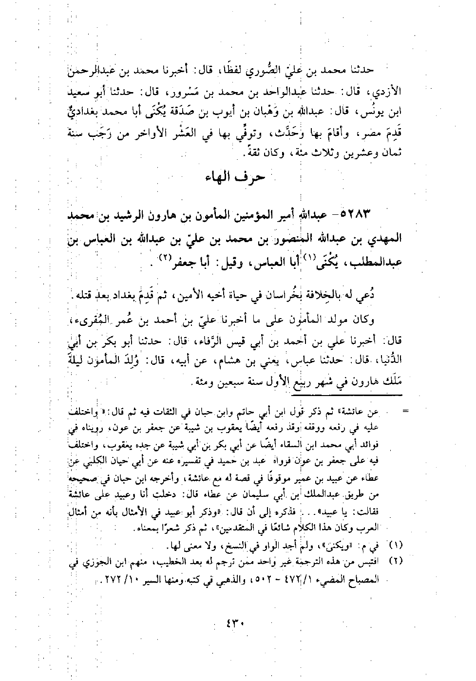 5283 - عبد اللَّه أمير المؤمنين المأمون بن هارون الرشيد بن مُحَمَّد المهدي بن عبد اللَّه المنصور بن مُحَمَّد بن علي بن عبد اللَّه بن العباس بن عبد المطلب، يُكنى أبا العباس، وقيل: أبا جعفر