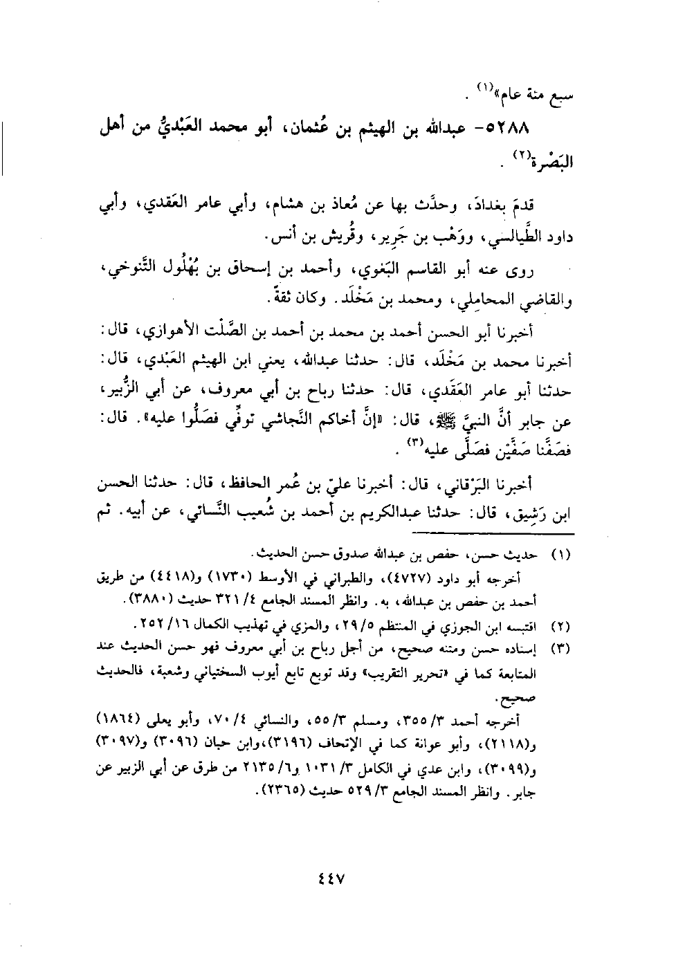 5288 - عبد اللَّه بن الهيثم بن عثمان أبو مُحَمَّد العبدي من أهل البصرة، قدم بغداد، وحدث بِها عن معاذ بن هشام، وأبي عامر العقدي، وأبي داود الطيالسي، ووهب بن جرير، وقريش بن أنس.