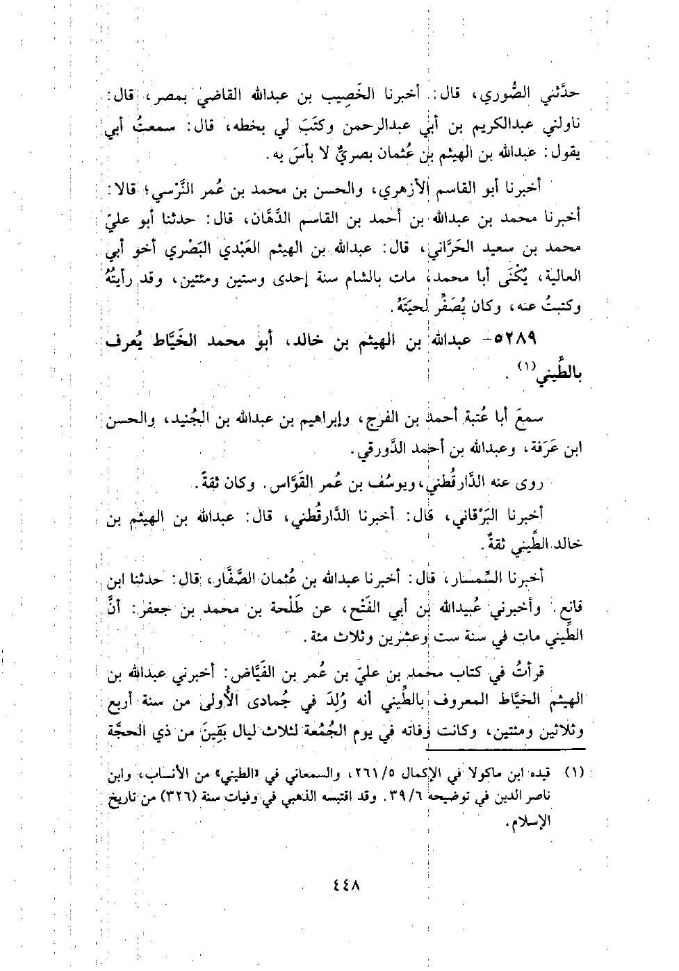 5289 - عبد اللَّه بن الهيثم بن خالد أبو مُحَمَّد الخياط، يعرف بالطيني سمع أبا عتبة أَحْمَد بن الفرج، وإِبْرَاهِيم بن عبد اللَّه بن الجنيد، والْحَسَن بن عرفة، وعبد اللَّه بن أَحْمَد الدورقي.
