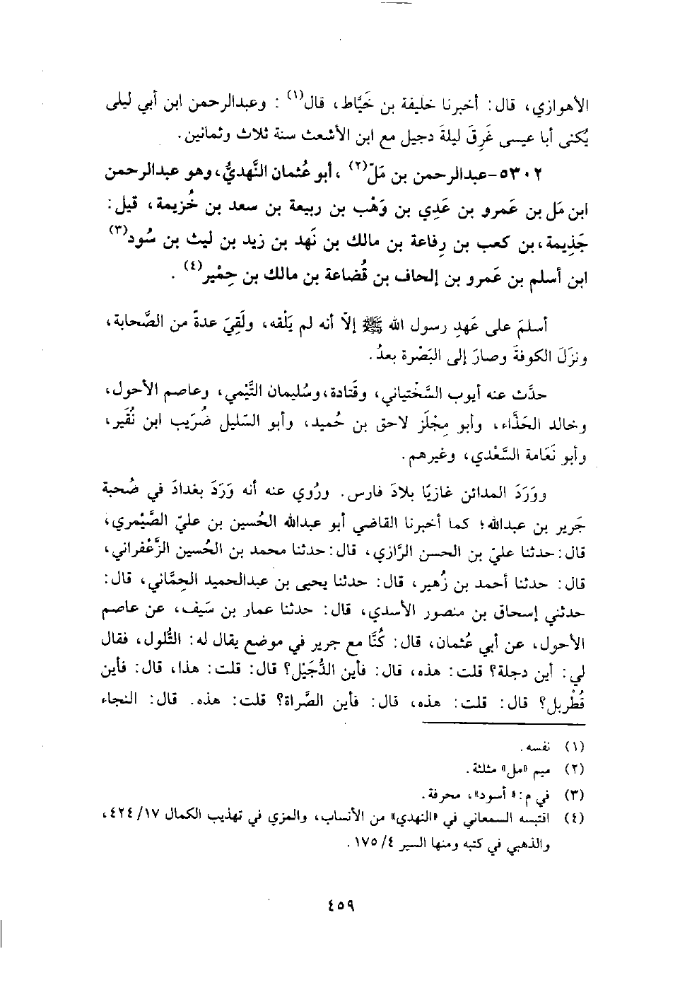 5302 - عبد الرحمن بن مل أبو عثمان النهدي، وهو عبد الرحمن بن مل بن عمرو بن عدي بن وهب بن ربيعة بن سعد بن خزيمة، قيل: جذيمة بن كعب بن رفاعة بن مالك بن نَهد بن زيد بن ليث بن سود بن أسلم بن عمرو بن إلحاف بن قضاعة بن مالك بن حمير