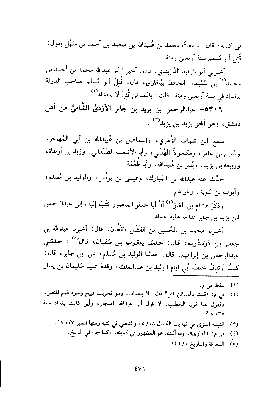 أَخْبَرَنَا أَبُو سَعِيد بْن حسنويه، قَالَ: أَخْبَرَنَا عَبْد اللَّه بْن مُحَمَّد بْن جعفر، قَالَ: حَدَّثَنَا عُمَر بْن أَحْمَد الأهوازي، قَالَ: حَدَّثَنَا خليفة بْن خياط، قَالَ: عَبْد الرَّحْمَن بْن يزيد بْن جَابِر مات سنة ثلاث وخمسين ومائة.