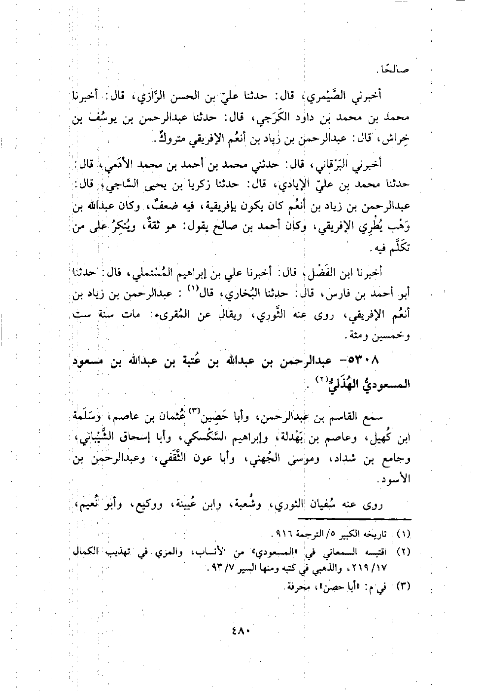 5308 - عبد الرحمن بن عبد اللَّه بن عتبة بن عبد اللَّه بن مسعود المسعودي الهذلي سمع القاسم بن عبد الرحمن، وأبا حصين عثمان بن عاصم، وسلمة بن كهيل، وعاصم بن بهدلة، وإِبْرَاهِيم السكسكي، وأبا إسحاق الشيباني، وجامع بن شداد، وموسى الجهني، وأبا عون الثقفي، وعبد الرحمن بن الأسود روى عنه سفيان الثوري، وشعبة، وابن عيينة، ووكيع، وأبو نعيم، ويزيد بن هارون، وروح بن عبادة، وأبو داود الطيالسي، وأبو النضر هاشم بن القاسم، وعاصم بن علي، وعلي بن الجعد.