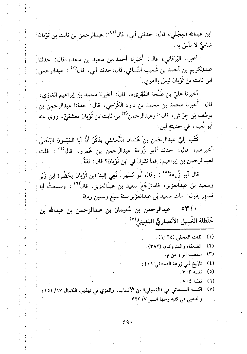 5310 - عبد الرحمن بن سليمان بن عبد الرحمن بن عبد اللَّه بن حنظلة الغسيل الْأَنْصَارِيّ المديني رأى سهل بن سعد الساعدي وأنس بن مالك، وسمع عكرمة مولى ابن عباس، وعاصم بن عمر بن قتادة، وحمزة بن أبي أسيد الساعدي، وسعد بن المنذر، روى عنه أبو نعيم الفضل بن دكين، وأبو غسان مالك بن إِسْمَاعِيل وأبو أَحْمَد الزبيري، والْحُسَيْن بن الوليد النيسابوري، وأبو الوليد الطيالسي، وغيرهم.