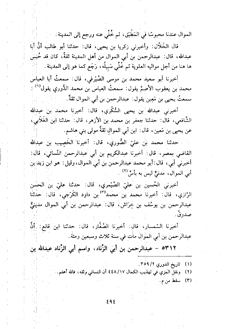 5312 - عبد الرحمن بن أبي الزناد واسم أَبِي الزناد عبد اللَّه بن ذكوان مولى آل عثمان بن عفان ويقَالَ مولى رملة بنت شيبة بن ربيعة ويكنى عبد الرحمن أبا مُحَمَّد سمع أباه، وهشام بن عروة، وموسى بن عقبة روى عنه عبد الملك بن جريج، والوليد بن مسلم، وعبد اللَّه بن وهب وسريج بن النعمان، وسليمان بن داود الهاشمي، وداود بن عمرو الضبي، وغيرهم.
