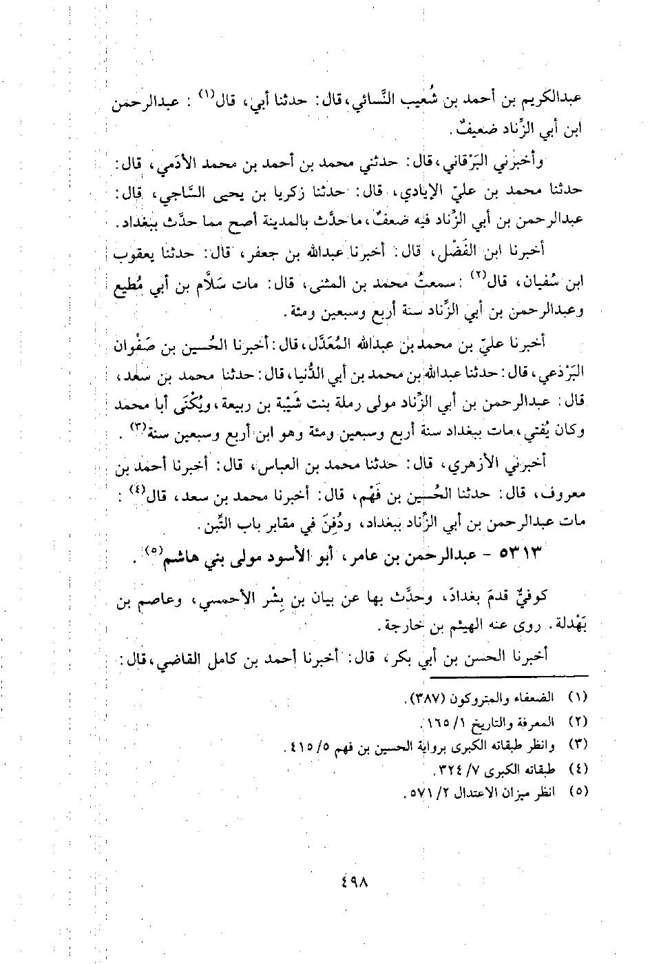 5313 - عبد الرحمن بن عامر أبو الأسود مولى بني هاشم كوفي قدم بغداد، وحدث بها عن بيان بن بشر الأحمسي، وعاصم بن بهدلة روى عنه الهيثم بن خارجة.