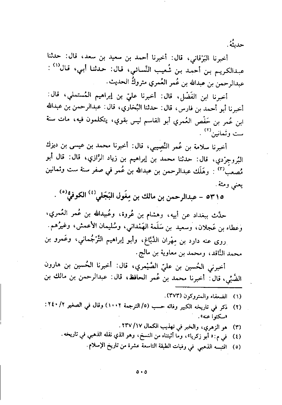 5315 - عبد الرحمن بن مالك بن مغول البجلي الْكُوفِيّ حدث ببغداد عَنْ أَبِيهِ، وهشام بن عروة، وعبيد اللَّه بن عمر العمري، وعطاء بن عجلان، وسعيد بن سلمة الهمداني، وسليمان الأعمش وغيرهم، روى عنه داود بن مهران الدباغ، وأبو إبراهيم الترجماني، وعمرو بن محمد الناقد، ومحمد بن معاوية بن مالج.
