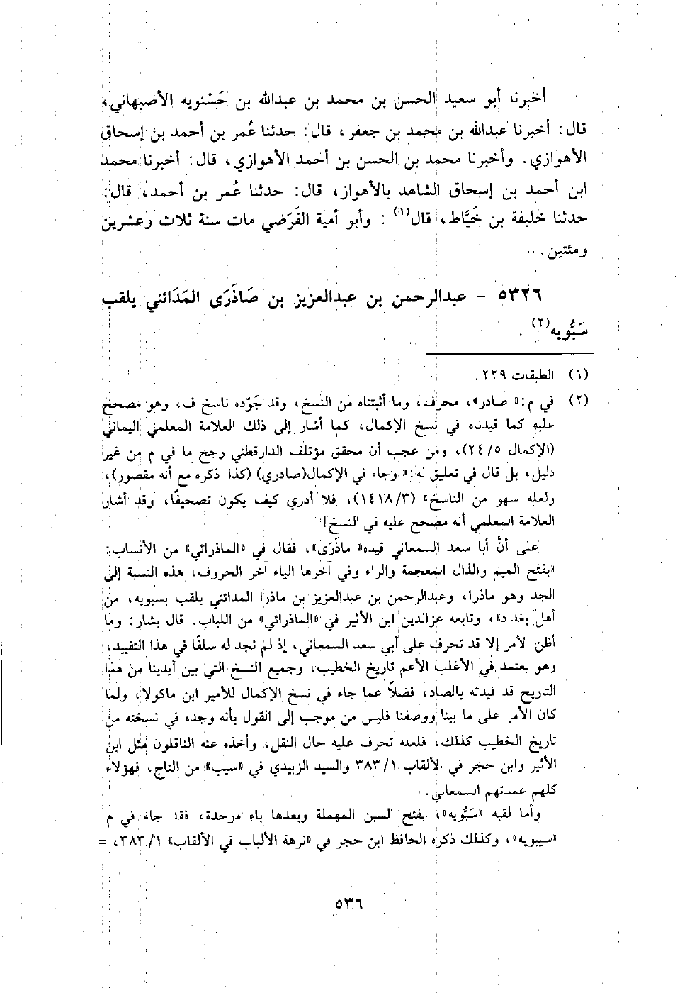 5326 - عبد الرحمن بن عبد العزيز بن صاذرى المدائني يلقب سَبُّوَيْهِ حدث عن أغلب بن تميم، وعامر بن صالح بن رستم، وعون بن المعمر، وعبد الحكيم بن منصور، وفضيل بن سليمان النميري، وبشر بن المفضل، وسليم بن أخضر، وغيرهم.
