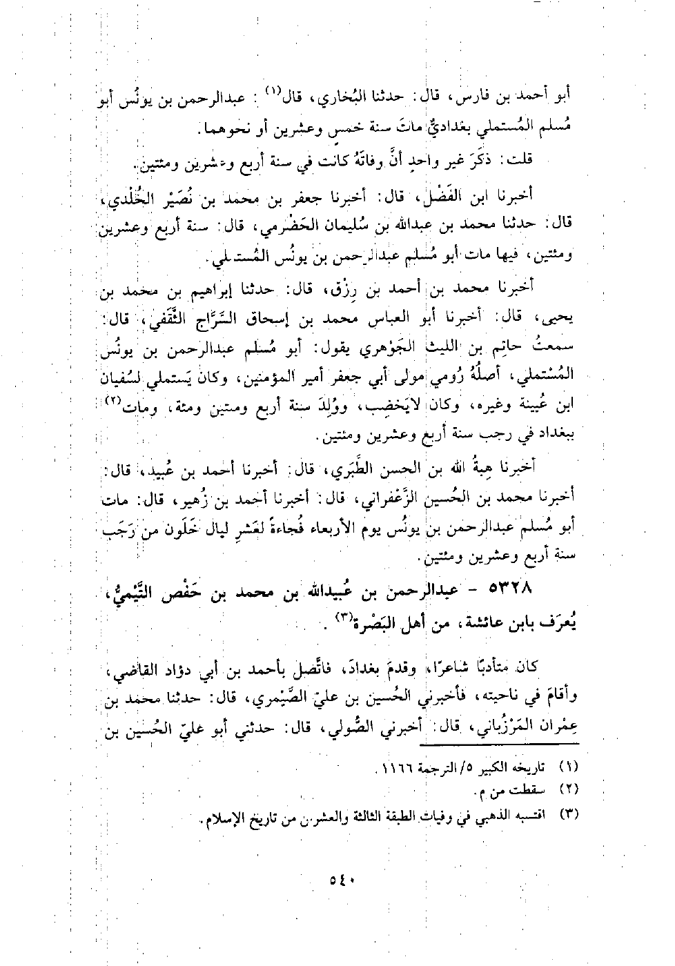5328 - عبد الرحمن بن عبيد اللَّه بن مُحَمَّد بن حفص التيمي يعرف بابن عائشة من أهل البصرة كان متأدبًا شاعرًا، وقدم بغداد، فاتصل بأَحْمَد بن أبي دؤاد الْقَاضِي، وأقام في ناحيته، فأَخْبَرَنِي الْحُسَيْن بن علي الصيمري، قَالَ: حَدَّثَنَا مُحَمَّد بن عمران المرزباني، قَالَ: أَخْبَرَنِي الصولي، حَدَّثَنِي أبو علي الْحُسَيْن بن يَحْيَى الكاتب، قَالَ: كان عبد الرحمن بن عبيد اللَّه بن مُحَمَّد ابن عائشة شاعرا وكان متصلًا بابن أبي دؤاد، فكان يتسخط عليه ولا يرضى أفعاله، فمن هجائه له: