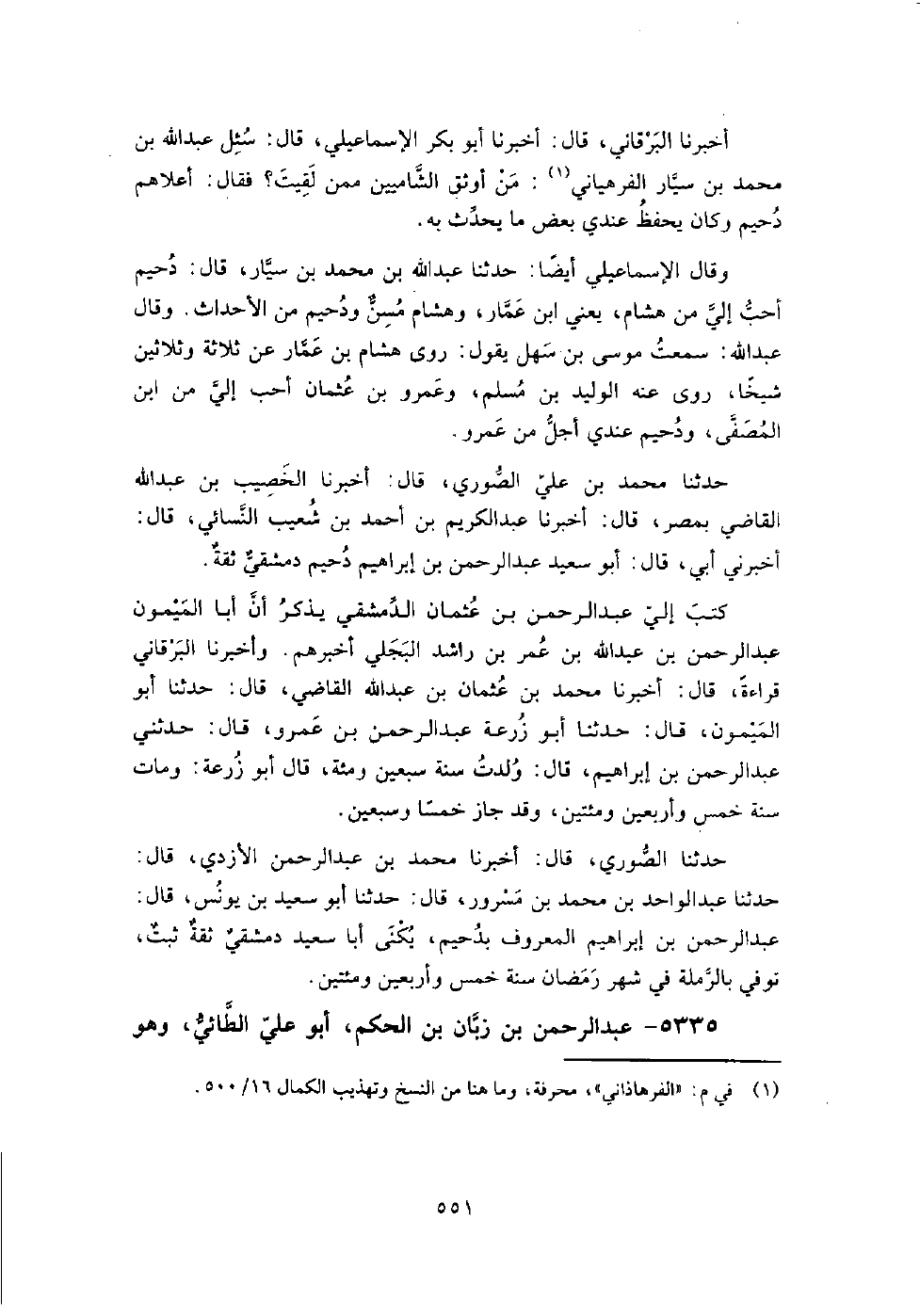 5335 - عبد الرحمن بن زبان بن الحكم أبو علي الطائي وهو عبد الرحمن بن أبي البحتري حدث عن عبد المجيد بن عبد العزيز بن أبي رواد، وعبد اللَّه بن إدريس، وحنظلة بن يونس، وأبي بكر بن عياش، وعبد الرحمن بن مُحَمَّد المحاربي، وعبد الصمد بن عبد الوارث.