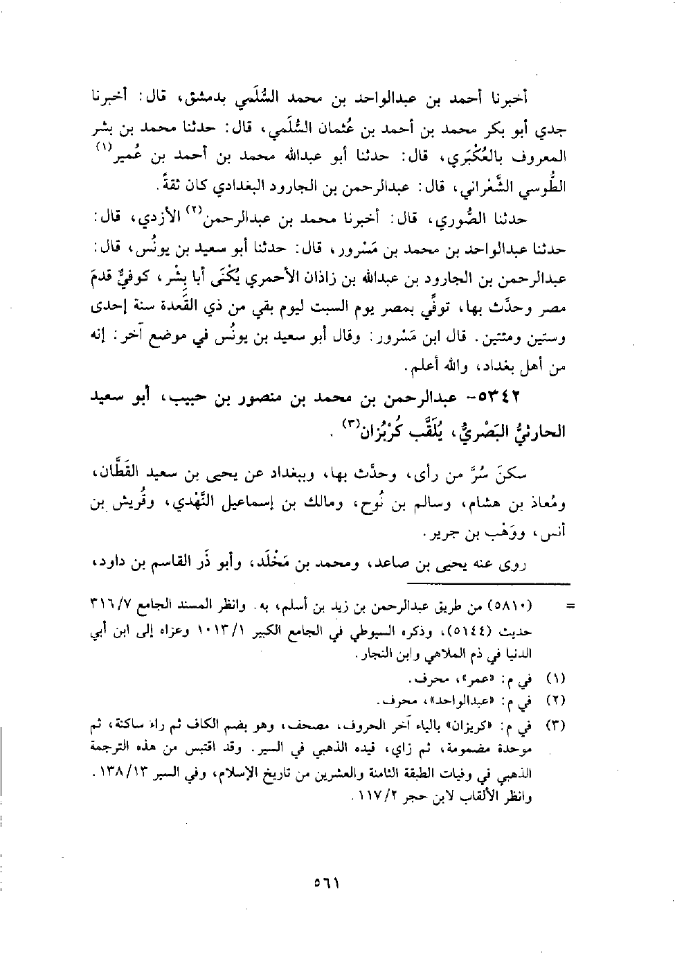 5342 - عبد الرحمن بن مُحَمَّد بن منصور بن حبيب أبو سعيد الحارثي البصري يلقب كربزان سكن سر من رأى، وحدث بها، وببغداد عن يَحْيَى بن سعيد القطان، ومعاذ بن هشام، وسالم بن نوح، ومالك بن إِسْمَاعِيل النهدي، وقريش بن أنس، ووهب بن جرير.