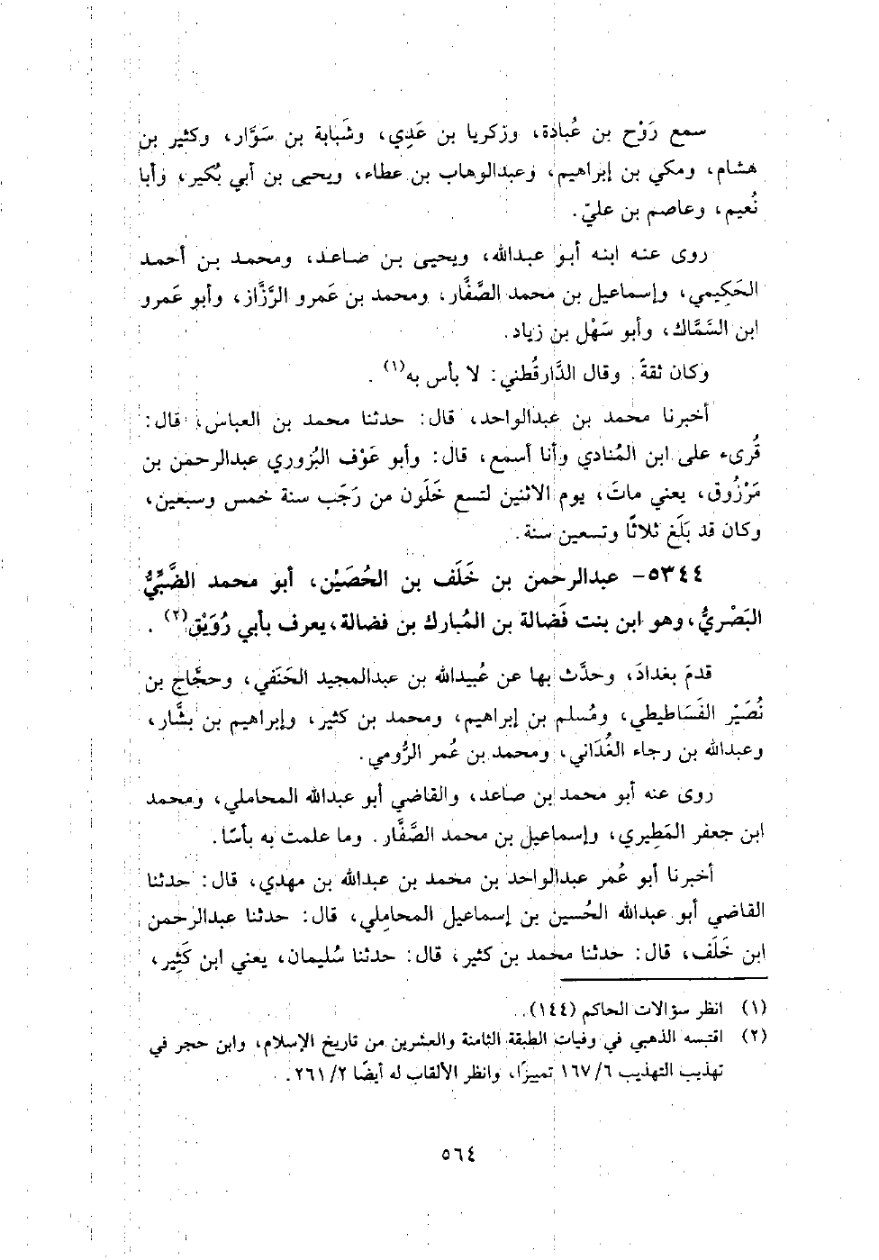 5344 - عبد الرحمن بن خلف بن الحصين أبو مُحَمَّد الضبي البصري وهو ابن بنت فضالة بن المبارك بن فضالة يعرف بأبي رويق قدم بغداد، وحدث بها عن عبيد اللَّه بن عبد المجيد الحنفي، وحجاج بن نصير الفساطيطي، ومسلم بْنُ إِبْرَاهِيمَ، ومُحَمَّد بن كثير، وإِبْرَاهِيم بن بشار، وعبد اللَّه بن رجاء الغداني، ومُحَمَّد بن عمر الرومي.